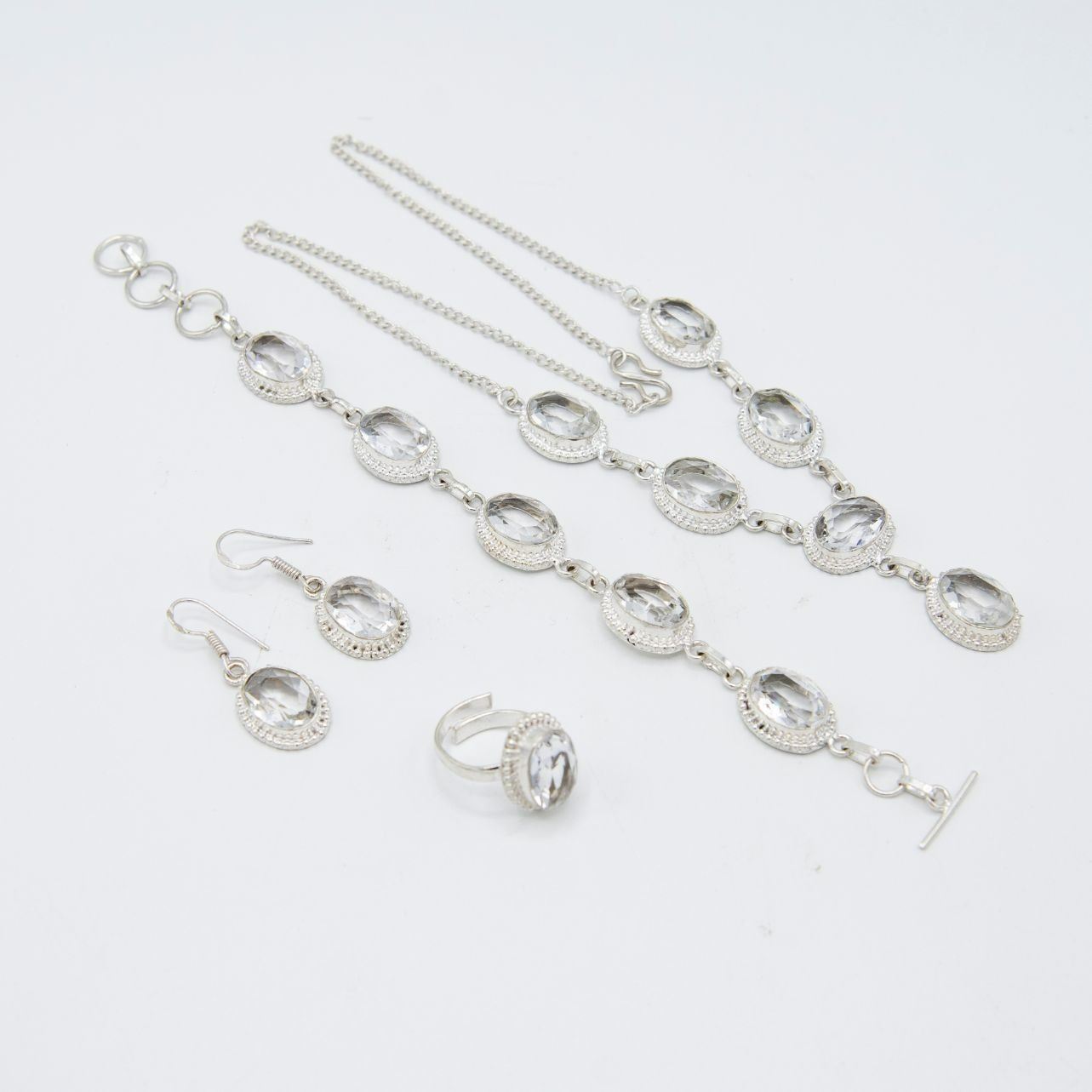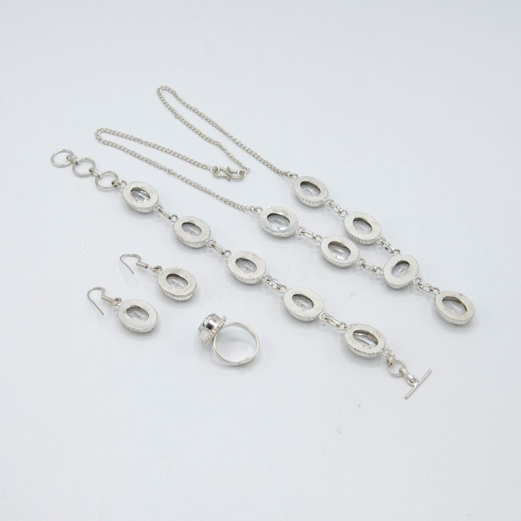 Sparkling Clear Quartz 4 Piece Jewelry Set. These faceted clear quartz are near flawless. They burst out with a dazzling sparkle and vivid even tone. The 4 piece set includes an 18 inch 6 single stone faceted necklace, bracelet, earrings and finger ring is adjustable. Mounted in .925 stamped sterling silver overlay. Total approximate weight of all pieces is 49 grams or 245 Cttw.