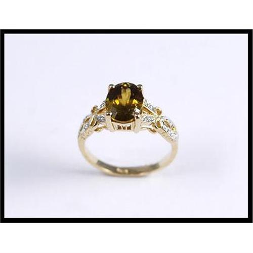This lovely ring is perfect for anytime wear! Its wonderful color and design features 1 oval cut green sphene that weighs 2.32 carats and 10 full cut diamonds set in 18K yellow gold. The size 6 ring weighs 3.60 grams and measures 9 millimeters (11/32 inches) x 7 millimeters (1/4 inches).