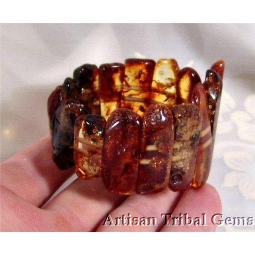 Deep Honey Baltic amber at it's finest. Magnificent stones full of glorious inclusion the bracelet has a height of 46mm in the front down to 21mm in the back with a gram weight of 28.  Strung on two strong stretch cord this bracelet provides the ultimate in comfort.