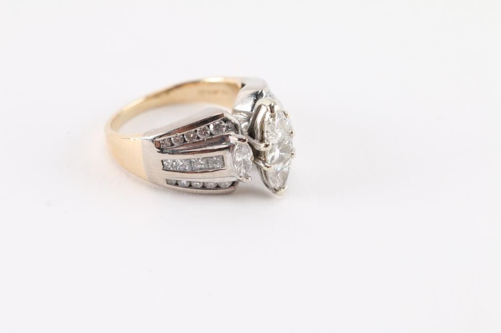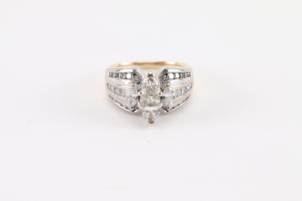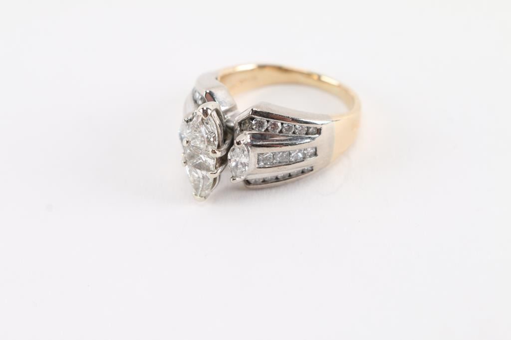 3 diamonds cut to shape the center marquise set in 14Kt two-tonegold. Size 7.5.