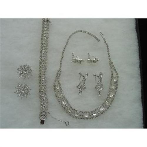 Extremely Sparkling 1950s Clear Rhinestone Parure Necklace, Bracelet 2 pair of Earrings. This can be worn all year long.</em></td>