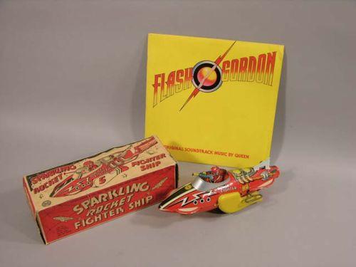 Sparkling Rocket Fighter Ship tin toy in original box, wind-up toy, like new. Some tears to box. 12" long.