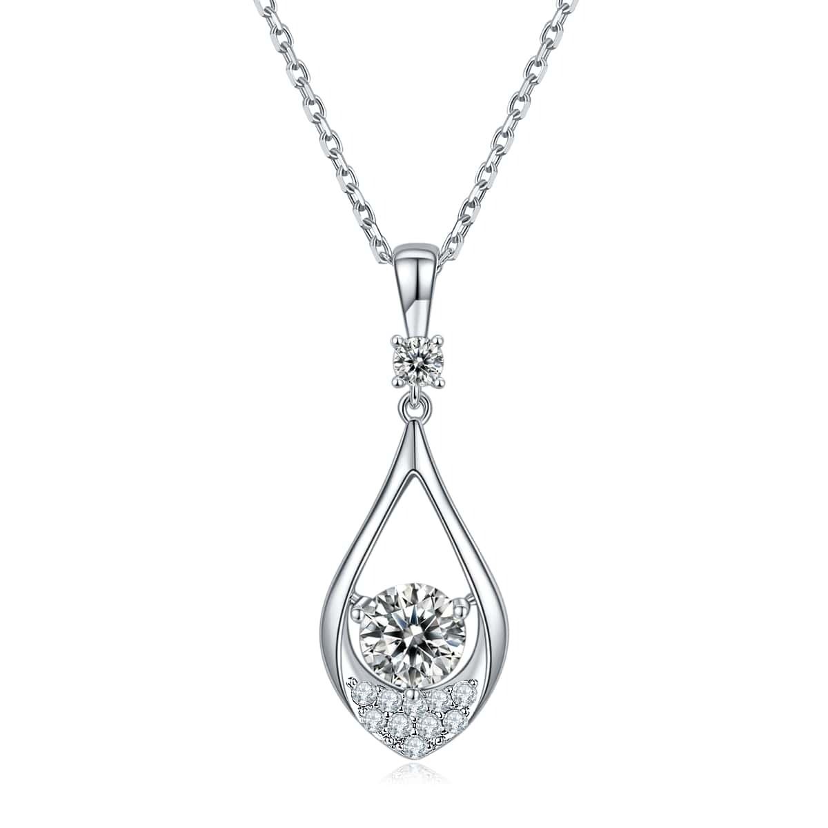 This Fire Moissanite is a VVS1 Brilliant Round Cut. The Color is White I-J measuring approx 6.5 mm. This Fire 1 Ct Moissanite is near flawless and bursting out with a full spectrum of colors. It is mounted in .925 solid sterling silver with 14 Kt White Gold Overlay, which gives the pendant its high polish and shine. With a refractive index of 2.65-2.69, this Moissanite exhibits more brilliance than a natural diamond. The total weight is approx. 1.7 grams including an 18" silver chain.