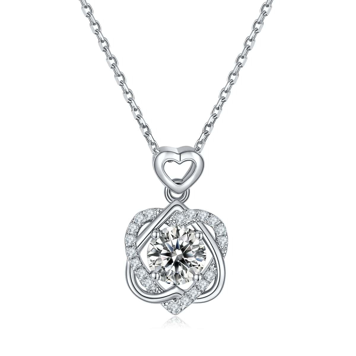 This Fire Moissanite is a VVS1 Brilliant Round Cut. The Color is White I-J measuring approx 6.5 mm. This Fire 1 Ct Moissanite is near flawless and bursting out with a full spectrum of colors. It is mounted in .925 solid sterling silver with 14 Kt White Gold Overlay, which gives the pendant its high polish and shine. With a refractive index of 2.65-2.69, this Moissanite exhibits more brilliance than a natural diamond. The total weight is approx. 1.7 grams including an 18" silver chain.