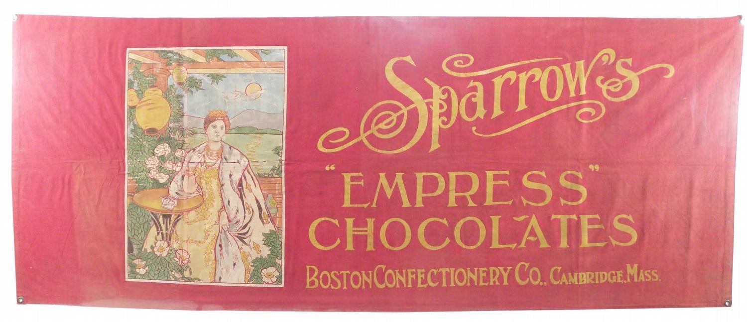 Sparrow's "Empress" Chocolates Canvas Banner. Boston Confectionery Co. Cambridge, Mass. Metal grommets at all four corners. Excellent condition. 71 X 28 inches.
