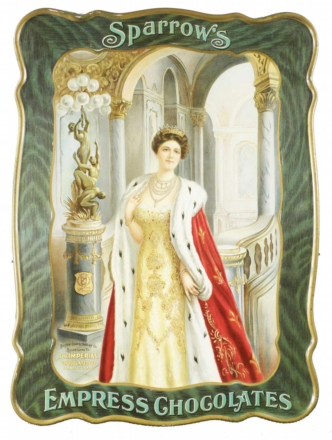 Sparrow's Empress Chocolates Self Framed Tin Sign. Boston Confectionery Co. Successors to The Imperial Chocolate Co. Cambridge, Mass. Couple of small wrinkles otherwise excellent condition. 16 1/2 X 22 1/2 inches.