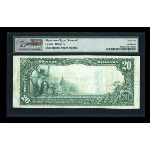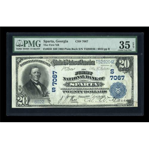 <B>Sparta, GA</B></I> - $20 1902 Plain Back Fr. 650 <B>The First NB</B></I> Ch. # (S)7067<BR> This becomes just the third large size note known from this elusive issuer and the only $20 extant. Well margined with bright surfaces and graded <B>PMG Choice Very Fine 35 EPQ</B></I>.<BR><BR><b>Shipping:</b> Coins & Currency (<a target="_blank" href="http://www.heritageauctions.com/common/shipping.php">view shipping information</a>)
