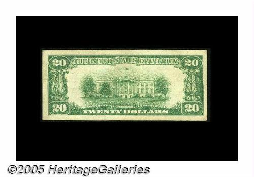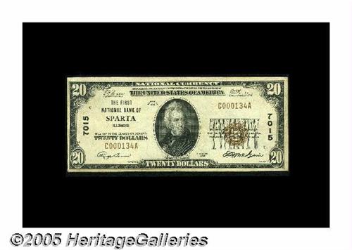<B>Sparta, IL</B></I> - $20 1929 Ty. 1 <B>The First NB</B></I> Ch. # 7015<BR>Although almost two dozen pieces are recorded from this one bank location in the new Kelly census, precious few of that number have ever been available to the collecting public, as most every example from here has been in the hands of one dedicated collector for the better part of a generation. Our records show just five public offerings of any kind from here, with the last specimen to sell, in identical grade to this piece, realizing a strong $1955 less than a year ago. <B>Very Fine.</B></I>