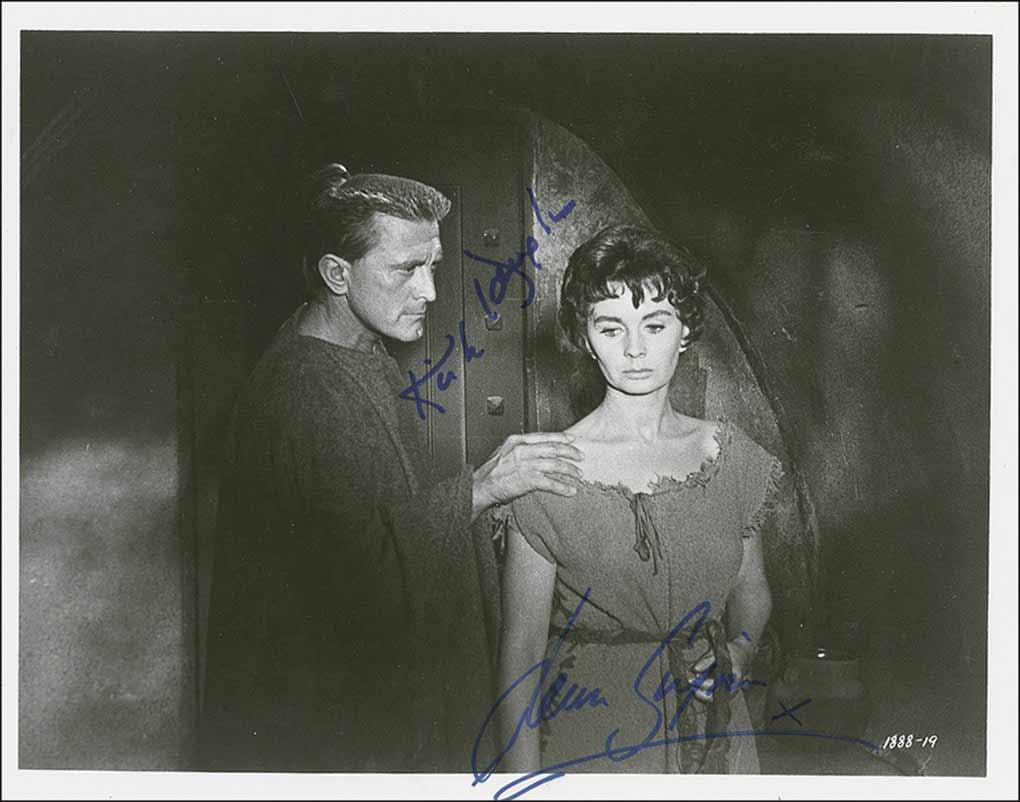 Glossy 10 x 8 photo from Spartacus, signed in blue felt tip by Kirk Douglas and Jean Simmons. In fine condition, with a few scattered light surface marks and dings.