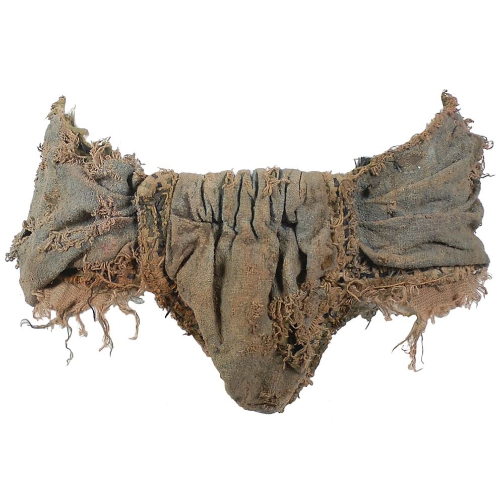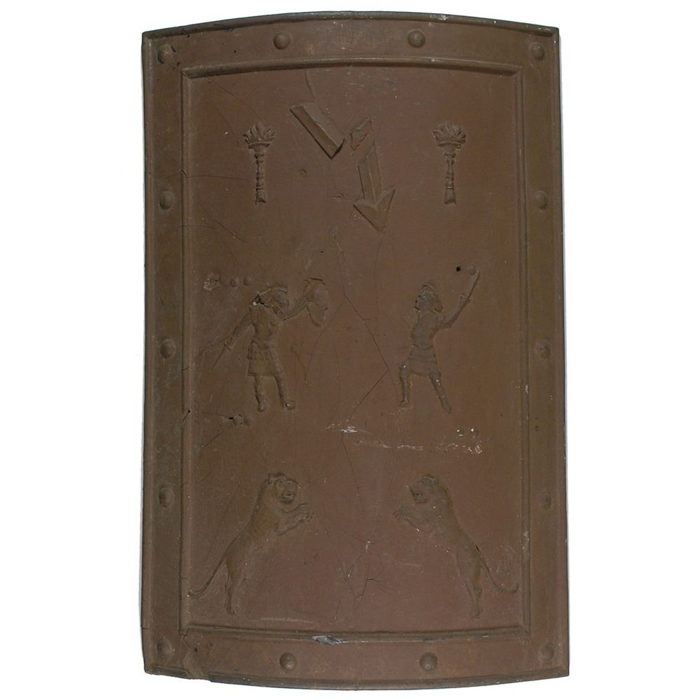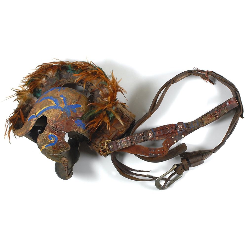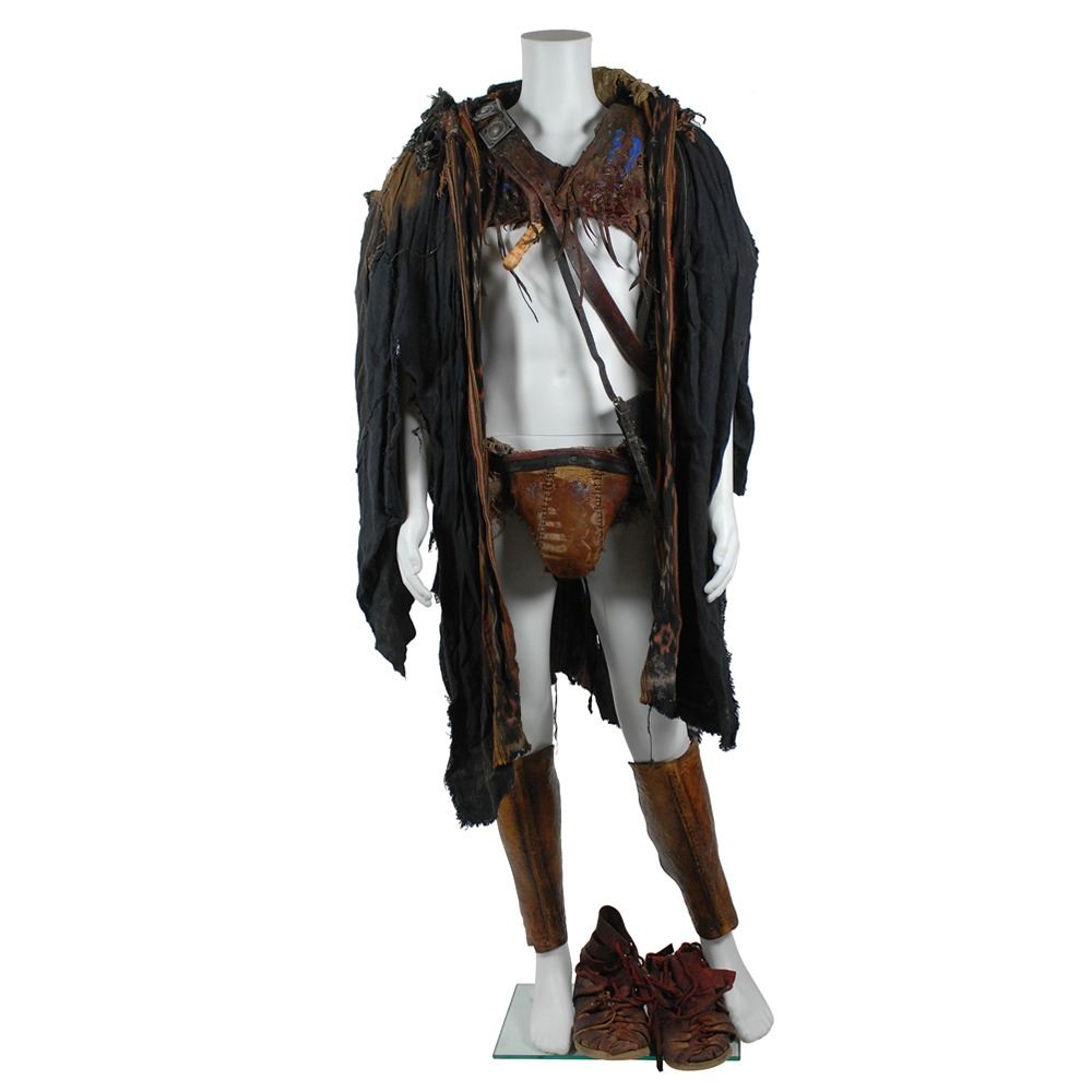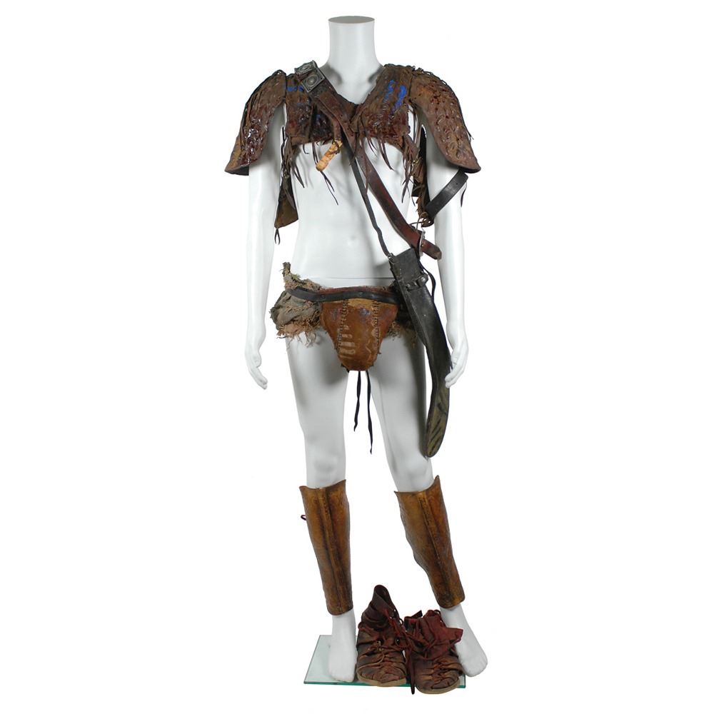 Complete and very detailed screen-worn male rebel costume from Season Three of the Starz network program Spartacus. Custom-made by the wardrobe department the costume consists of: a molded plastic helmet with a feather plume, with various color paint accents; a brown leather chest piece; a gray cotton cloak highlighted with orange, green, and red; a gray cotton subligaria; a molded adjustable cod piece covered in animal fur; a brown leather bandolier with scabbard; two leather forearm covers; a leather cuff; a thin brown leather belt adorned with metal plates and stained with blood; a leather belt with a small piece of tape on the inside labeled "#1002"; and a pair of brown sandals. Also included is the large curved fiberglass battle shield, 31.5˝ high, painted brown with raised reliefs of gladiators and large jungle cats, with two leather straps on the reverse, and cracks and chips to the shield. In fine condition, with intentional wear and distress.