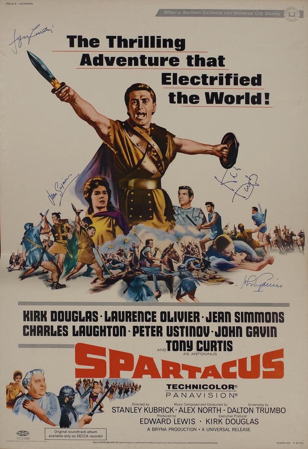 Original color 40 x 60 movie poster for the reissue of Spartacus, signed in blue felt tip by Kirk Douglas, Jean Simmons, John Gavin, and Tony Curtis. Rolled and in very good condition, with scattered creases, tack holes to corners, and small edge tears and dings.