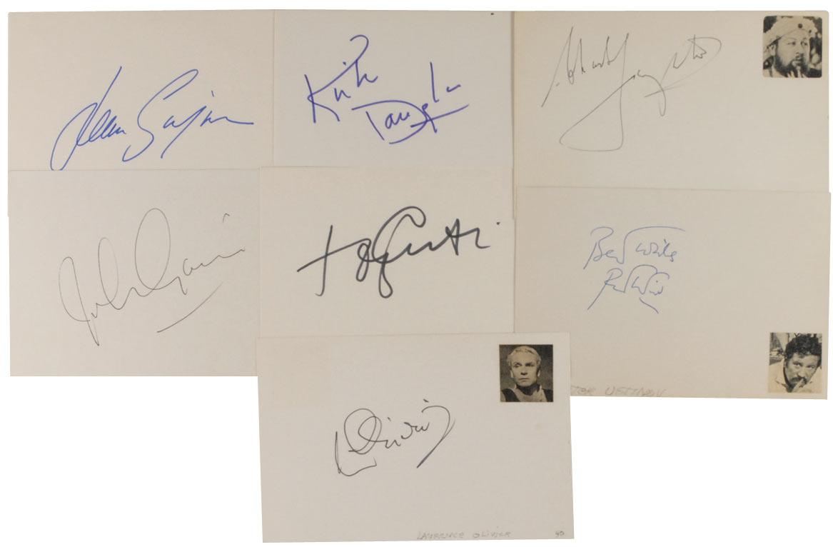 Ink and felt tip signatures of Kirk Douglas, Laurence Olivier, Tony Curtis, Jean Simmons, Charles Laughton, Peter Ustinov, and John Gavin on individual various size off-white cards. In fine condition, with some mild toning to a few cards, as well as three clipped photos affixed to their respective cards.