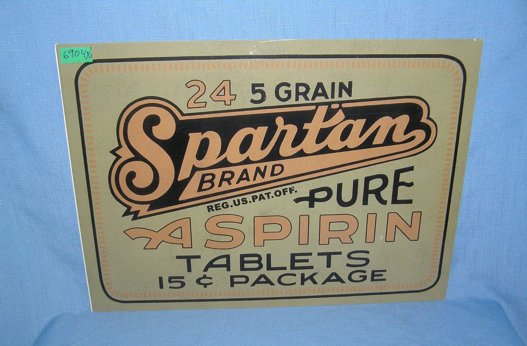 Spartan Brand pure aspirin retro style advertising sign printed on PVC hardboard these signs are auctioned for their decorative and display purposes 12 inches by 16 inches est. value $50.00-$60.00