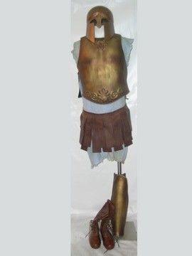 The costume is comprised of two-piece Kydex front and back chest armor with leather straps on the sides, a tattered blue sleeveless tunic with some stains on it, a tie-up tan suede 'skirt with tassels,' a pair of woven wrist guards with leather string ties, a pair of bronze colored Kydex leg greaves, a pair of red high-top' leather sandals/boots, and a bronze-painted hard plastic helmet with foam padding lining the interior.
