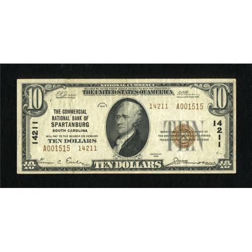 <B>Spartanburg, SC</B></I> - $10 1929 Ty. 2 <B>The Commercial NB </B></I> Ch. # 14211<BR> This 14000 charter example is bright and still displays some embossing. <B>Very Fine-Extremely Fine</B></I>.<BR><BR><b>Shipping:</b> Coins & Currency (<a target="_blank" href="http://www.heritageauctions.com/common/shipping.php">view shipping information</a>)