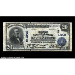 Spartanburg, SC - $20 1902 Plain Back Fr. 654 The First NB Ch. # (S)1848An above average large example from this well collected community. Fine-Very Fine, with bold black signatures. A small tape repair of a split at the bottom affects little. Important notice: We expect to be auctioning lots at the rate of 200-250 per hour. Sometimes eBay Premier live bid software cannot keep up with that pace, so we strongly recommend that you place a realistic proxy bid now as insurance to avoid disappointment. Also please note that all Heritage/CAA lots purchased through eBay Premier carry a 20% Buyer's Premium. Please make sure you read the Terms and Conditions.