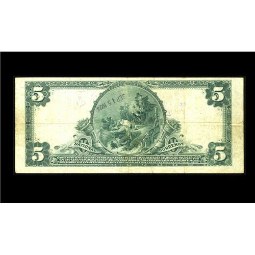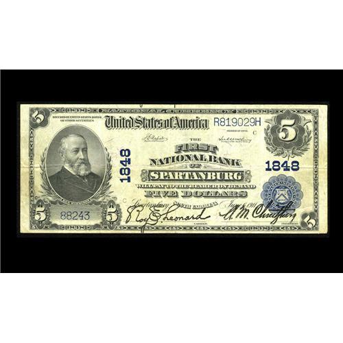 <B>Spartanburg, SC</B></I> - $5 1902 Plain Back Fr. 602 <B>The First NB </B></I> Ch. # 1848<BR>This was the most prolific of the four issuers located here and was one of the three federally chartered banks in this community to fail during the Depression. While not especially scarce by any means, the note retains considerable crispness, is nicely margined and shows darkly stamped signatures. <B>Very Fine.</B></I>