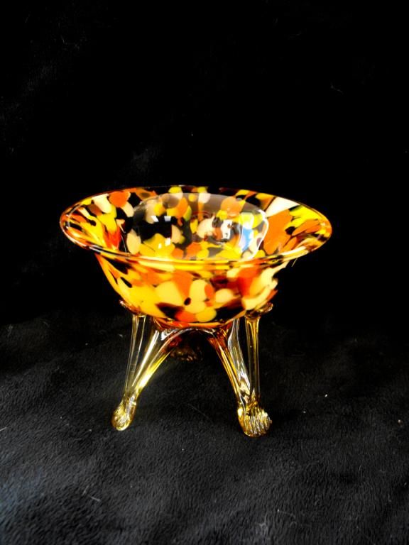 Art Nouveau Bohemian glass bowl is from Franz Welz. End of the day mix is blown of orange, white, yellow and blood red glass with amber casing. Footed tripod base has extended arm that attachthe the bottom of the round bowl and is blown of translucent amber citron glass. On each round foot has a multiple fine rib pressed pattern and there is not damage to the tripod base.Rim is cut and polished with a two flea bite chips along the edge of the rim, as pics will show and does not distract. Excellent condition. No hairline breaks or mineral deposit.Measures 3-3/4" tall, 4-1/2"diameter rim and the base is 2-3/4" diameter.