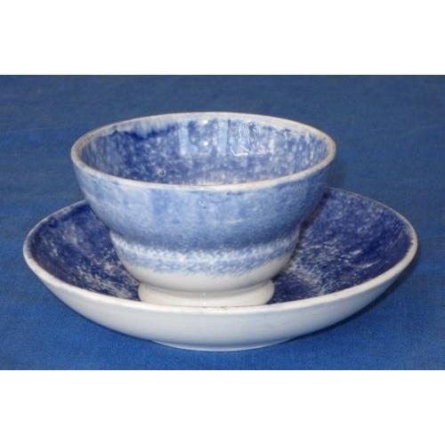 Blue Spatterware sponge handeless cup and saucer made about 1850. The cup and saucer is in very nice condition. It does have a small chip on the bottom rim of the cup. The cup is 4 inches in diameter and 2.75 inches tall. The saucer is 6 inches in diameter.