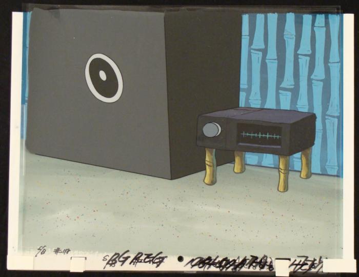 To create production cels, the original animator's drawing is transferred onto an acetate cel (by hand-inking and/or photo copying). The cel is then hand-painted on the reverse side. The background accompanying this set-up is a hand-painted original production background. The background is ready to be matted and framed. It is a colored background with a cel and has the animator's notations at the bottom of the background and the cel. The cel is multilayered: the first cel is a knob, then the second cel is the speakers, the third cel is the stereo, and finally the last cel is the background wall.