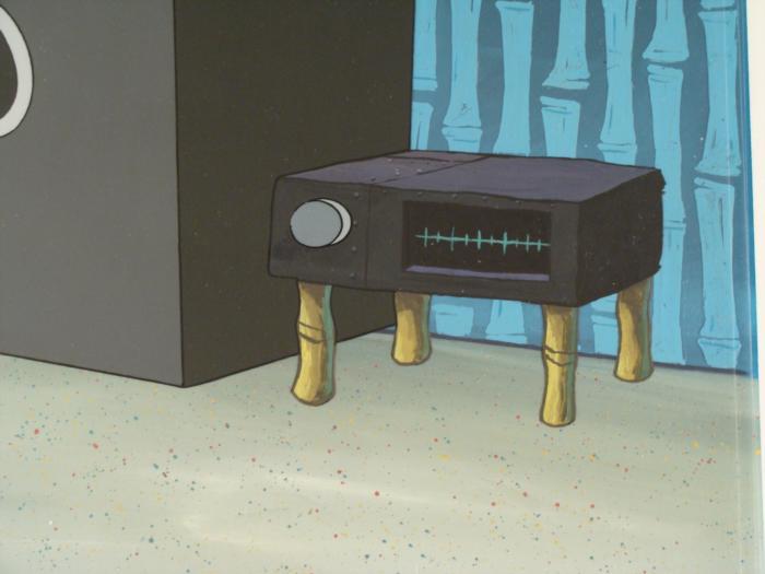 This original hand-painted background and animation cel are from the Nickelodeon TV show SpongeBob Squarepants. The story takes place under the deep blue sea in Bikini Bottom, where SpongeBob resides. SpongeBob, who is a yellow, porous sponge, is your typical happy-go-lucky character, as he is always cheerful and enjoys making people laugh. Patrick Star, SpongeBob's neighbor who is a starfish, is your average children's show idiot, as he boasts knowing nothing and is often getting himself into ridiculous situations. Between the homes of these two lies the home of the miserable Squidward, a squid, who is known for being grouchy and playing tricks on SpongeBob and Patrick. Both SpongeBob and Squidward work at the Krusty Krab, a fast food business run by the greedy money-loving Mr. Krabs, a crab, the arch rival of the evil, possibly misunderstood, Plankton. Another neighbor, Sandy Cheeks, an athletic squirrel who normally wears an astronaut's space suit, was introduced in "Tea at the Treedome." She spends most of her time inventing and experimenting. Looks like a speakers system.Original Production Background and Animated Cel Overall Size of Background: 10 1/2" x 13 1/2" Overall Size of the Cel: 10 1/2" x 12 1/2" Very good condition This is an original hand-painted cel set-up used in the production of an episode of "SpongeBob SquarePants." Each one-of-a-kind set-up represents a slight change in position of the characters. When individually photographed and projected in rapid succession, the images appear to move.
