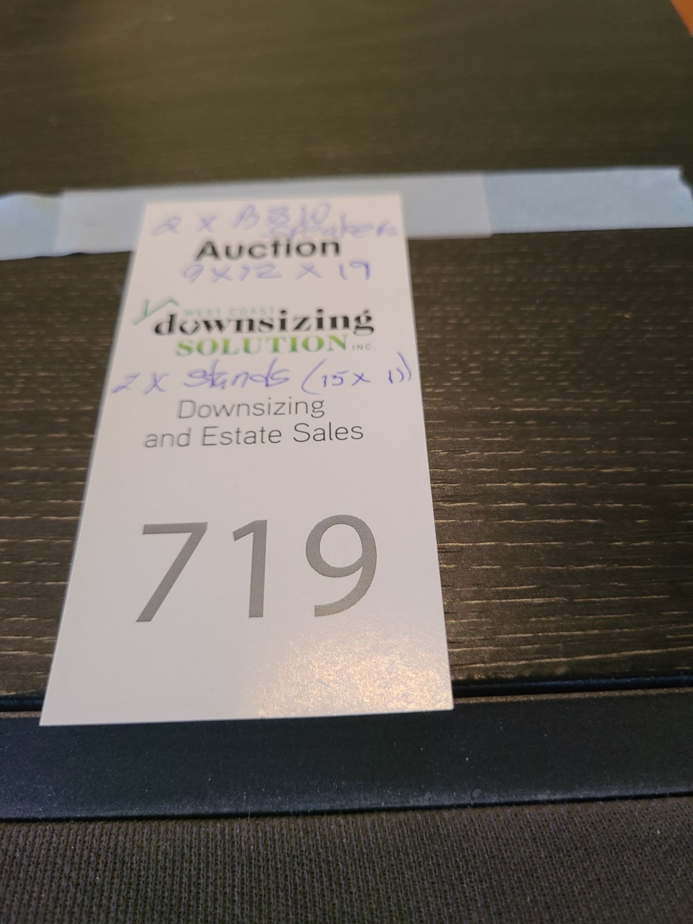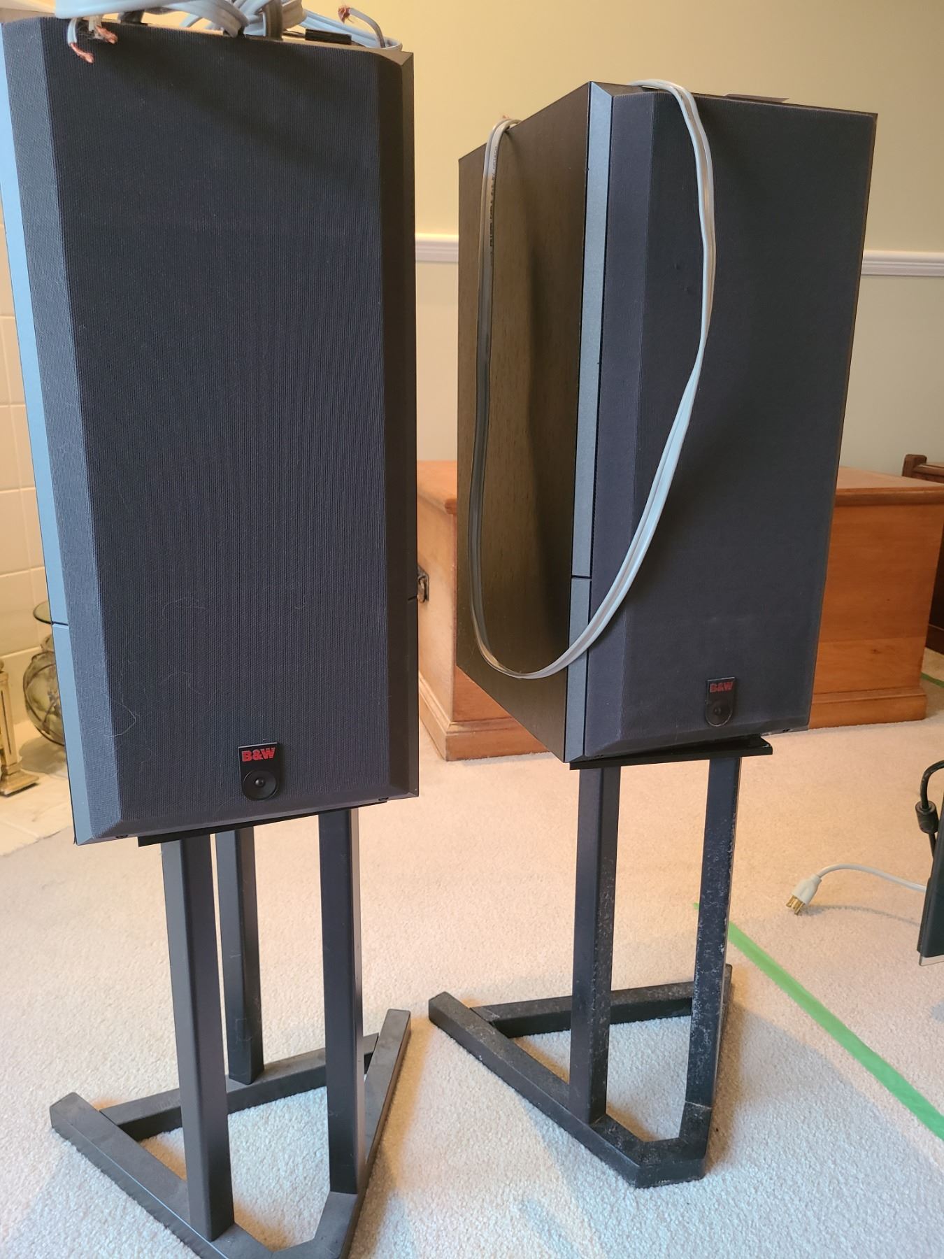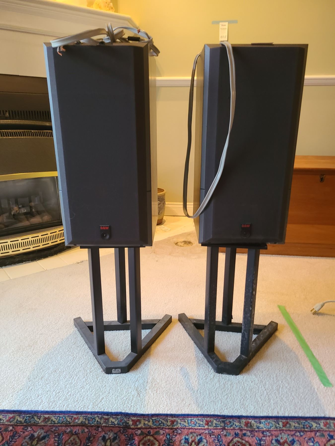 Two B&W speakers 9x12x19 on metal stands 15x11. Pickup at 10 am.