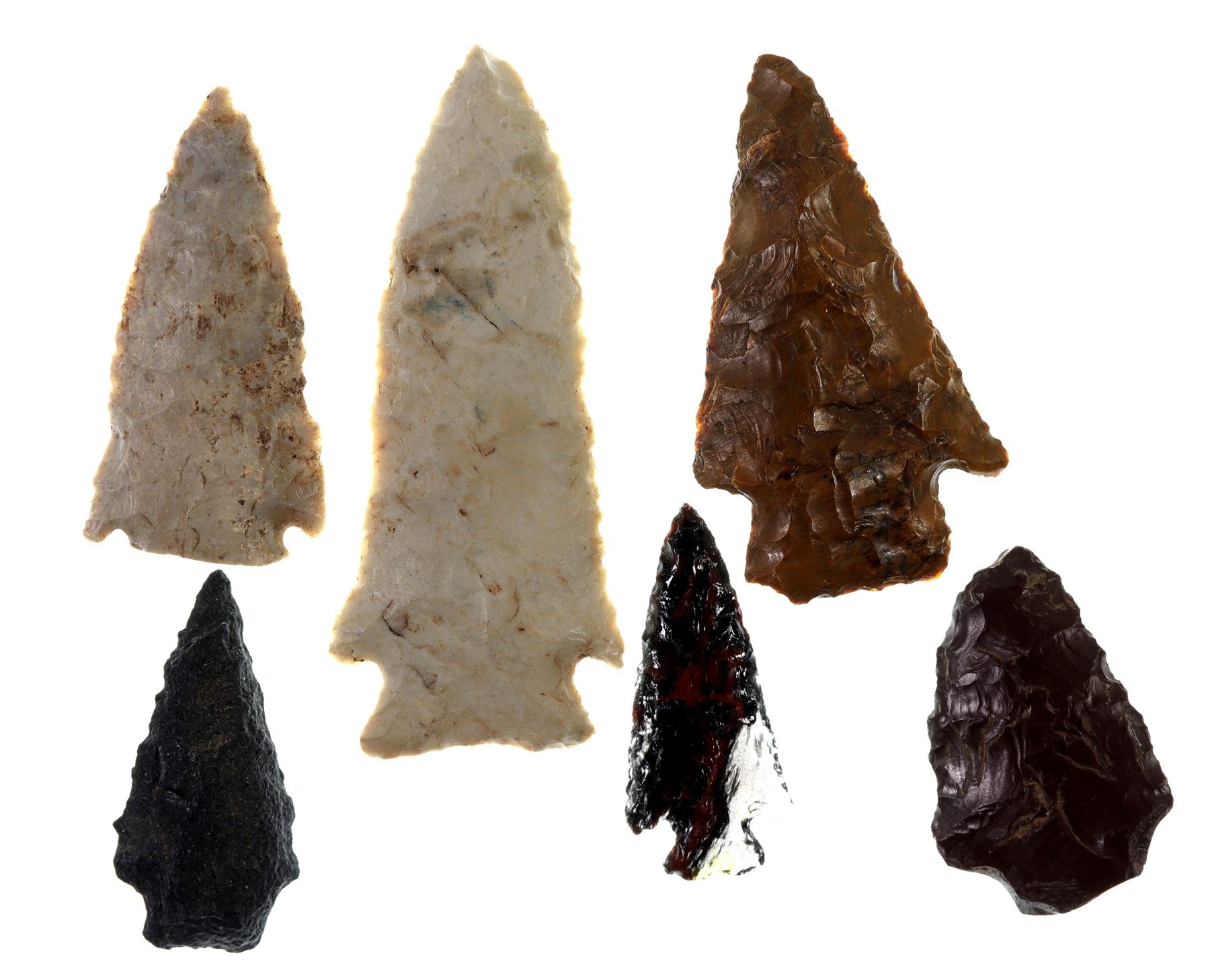 Lot includes 6 pieces of unknown US origin. The obsidian piece may be modern. These points measure from 1.75" up to 3.25"