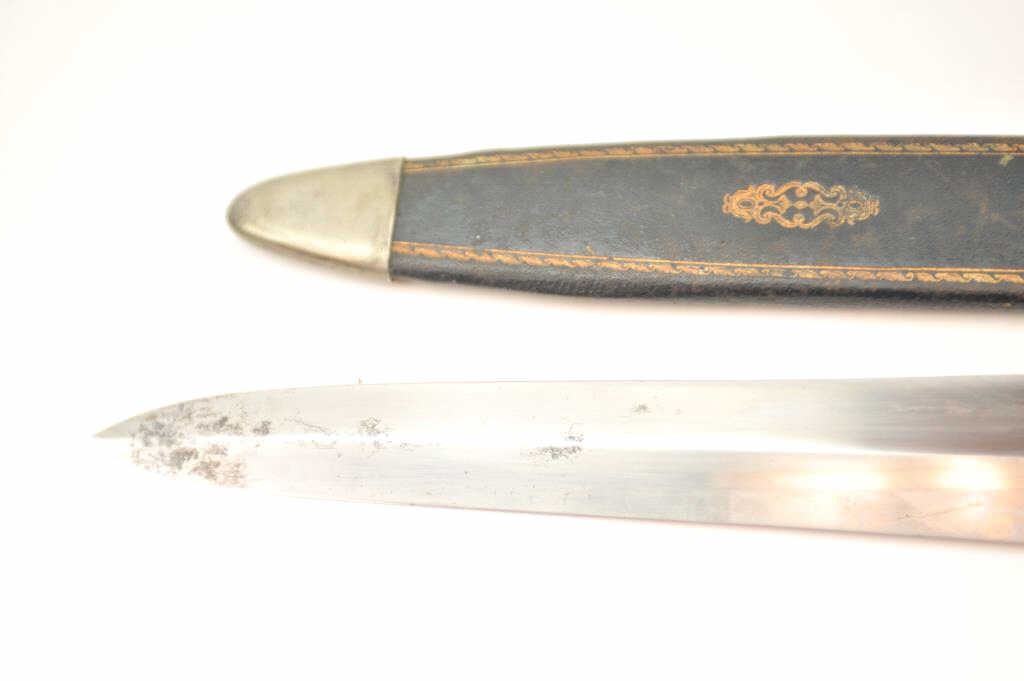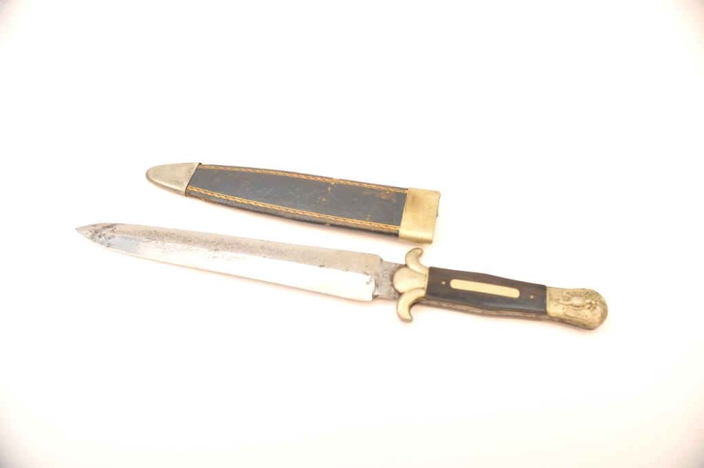 Spear point Bowie knife marked, “Wilson Swift, Broad Street, Sheffield”, with the “DCL” trademark on the reverse. Fancy German silver mounts showing a Mexican snake and eagle on the pommel with dark colored cowhorn grip in good to very good overall condition. The blade is full dimensions with most original polish, some pitting and erosion near the tip and other areas of minor aging. The knife includes the associatedscabbard of the same period in very good condition. The piece measures 13 7/8” overall length. Est.: $1,000-$2,000.