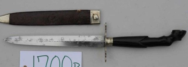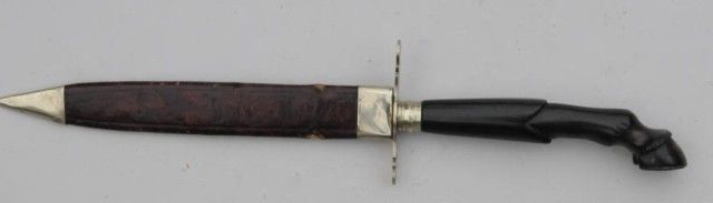 Spear point Bowie knife with carved horn grip in form of a horse hoof; 11-3/4” overall; 6-1/2” blade etched “Draw Me Not Without Nor Sheath Me Not without Honor”; good to very good; light cleaning, minor pitting; withoriginal scabbard showing minor losses and aging. From an old collection in Auburn, CA in the heart of the Gold Country. Est.: $400-$800.