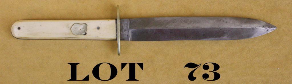 Spear point bowie knife with bone grips approx. 9-1/2” overall with an approx. 6” blade marked “Continental Cutlery Co., Sheffield”. The blade shows slight traces of etching on one side and is in overall goodcondition with some spots of erosion and cleaning, the grip scales are good with a German silver escutcheon on one side, loose oval cross guard. Est.: $250-$450.