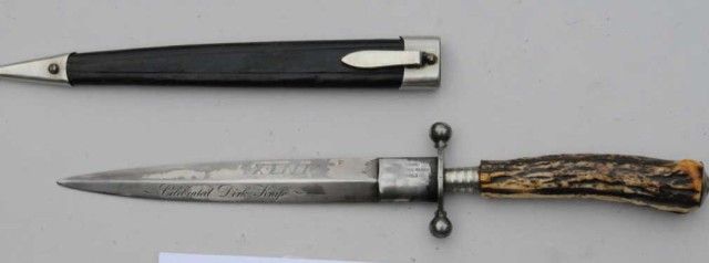 Spearpoint Dirk knife marked, XLNT on blade and engraved, “Celebrated Dirk Knife”, inscripted with makers stamp on Ricasso, Wragg, Sheffield Island Works, Sheffield. Blade is nicely made and reinforced. StagGrip, original scabbard. 11 ¼” overall. Very Good Condition, From Gold Rush region of Northern CA, near Auburn. Est $600-$1,200