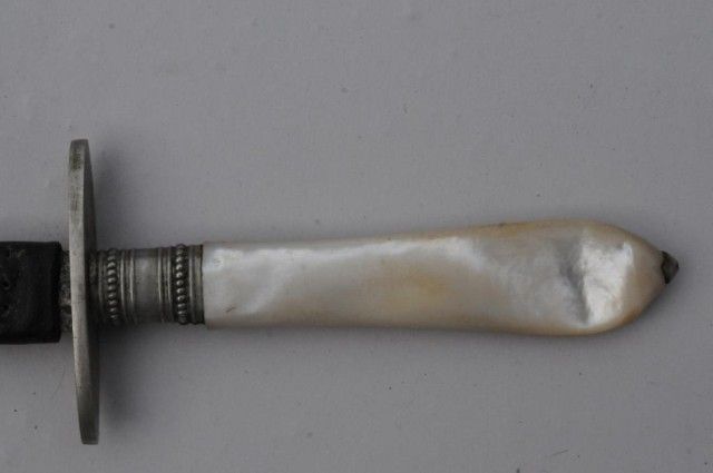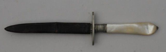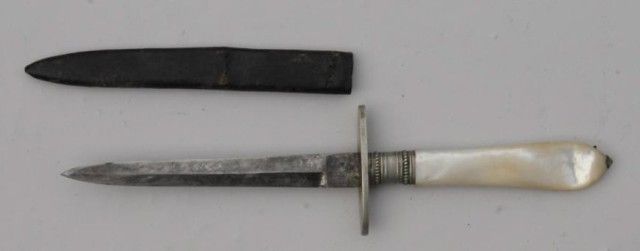 Spearpoint Dirk with Pearl Grip marked, “A. Williams Sheffield, England”, with EBRO Trademark Circa 1890-1900’s, 7 ¼” overall. Good to very good with scabbard. From Gold Rush region of Northern Ca., near Auburn. Est $300-$600