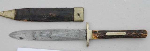 Spearpoint dirk marked Alexander Sheffield with N.Y. and Union shield. The scabbard shows same N.Y. and shield. 9 ¼” overall. Blade shows pitting and cleaning. Fair to good overall. Scabbard retains tip andthroat. Button hanger missing. Civil war era made for N.Y. state troops who were involved in most major battles. (Auburn etc) Est.: $500-$1000
