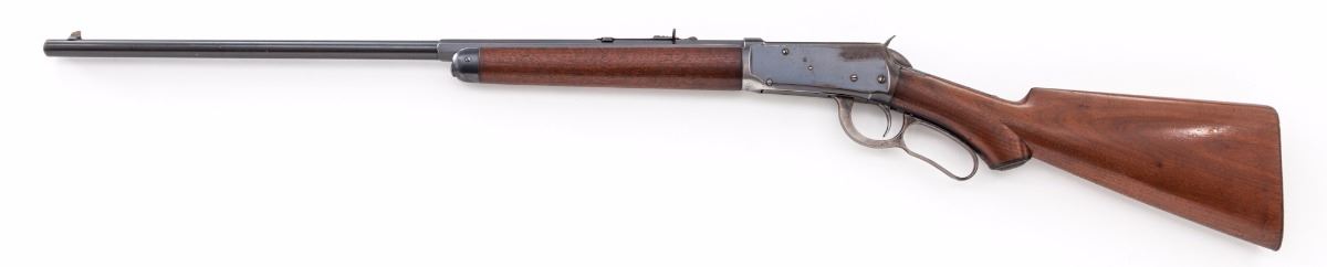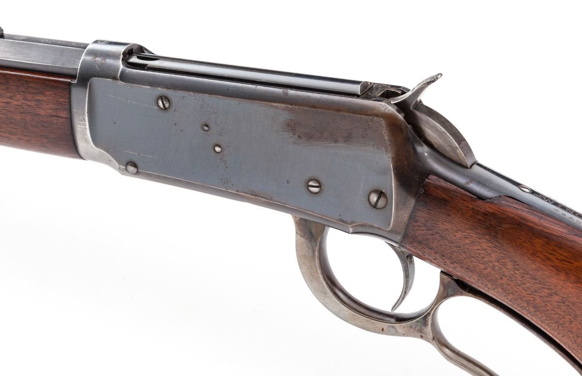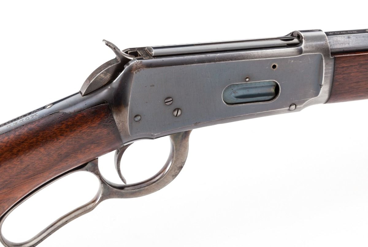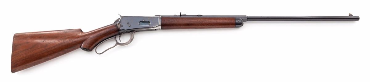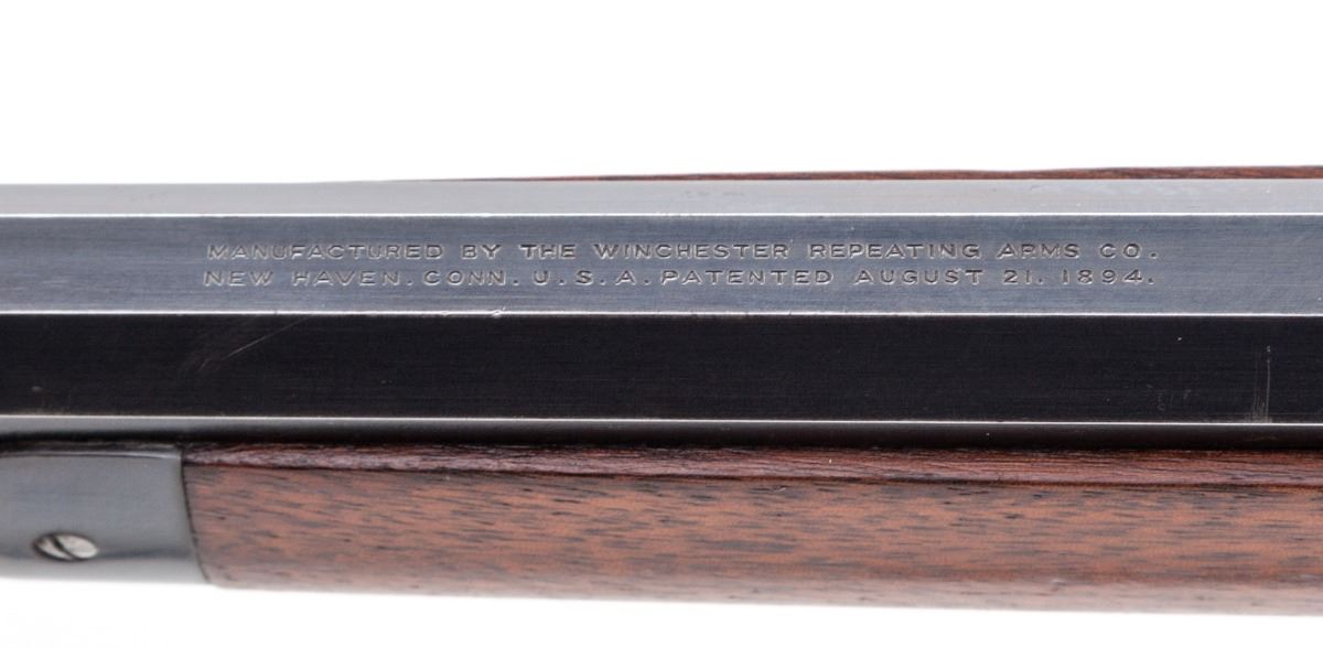 Special Feature Winchester Model 1894 Lever Action Rifle, #324261, .30 WCF cal., 26'' half-round half-octagon barrel, half magazine, pistol-grip walnut stock and forend, Winchester pistol grip cap held in place by a finely engraved screw, shotgun butt, with dovetailed blade front sight and buckhorn rear sight with elevator. Mfg'd 1905. Condition is very good retaining approx. 75%-80% original blue with most of the wear to the high edges and at balance point. Lever and hammer retain approx. 25%-30% case colors. Left side of frame with patch of mild pitting and discoloration to finish. Stock with normal bruises and scratches, as well as some darkening and a few small losses where wood meets upper tang. All markings remain crisp and clear. Action and bore are excellent. Est.: $2,000-$2,500. (C&R)
