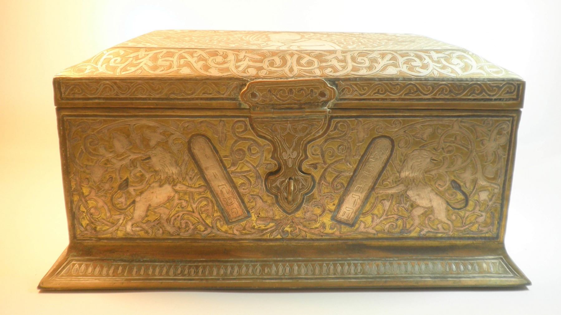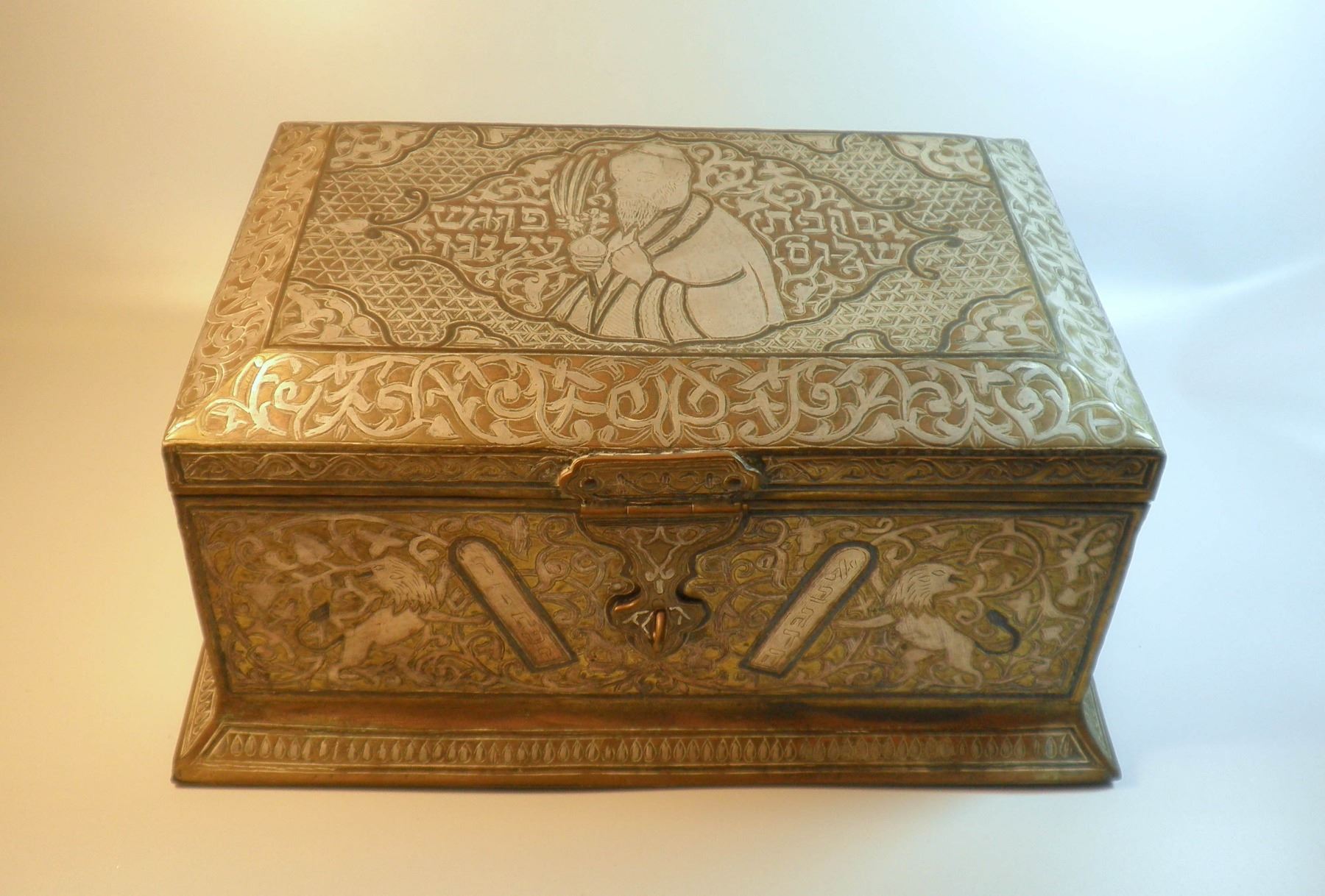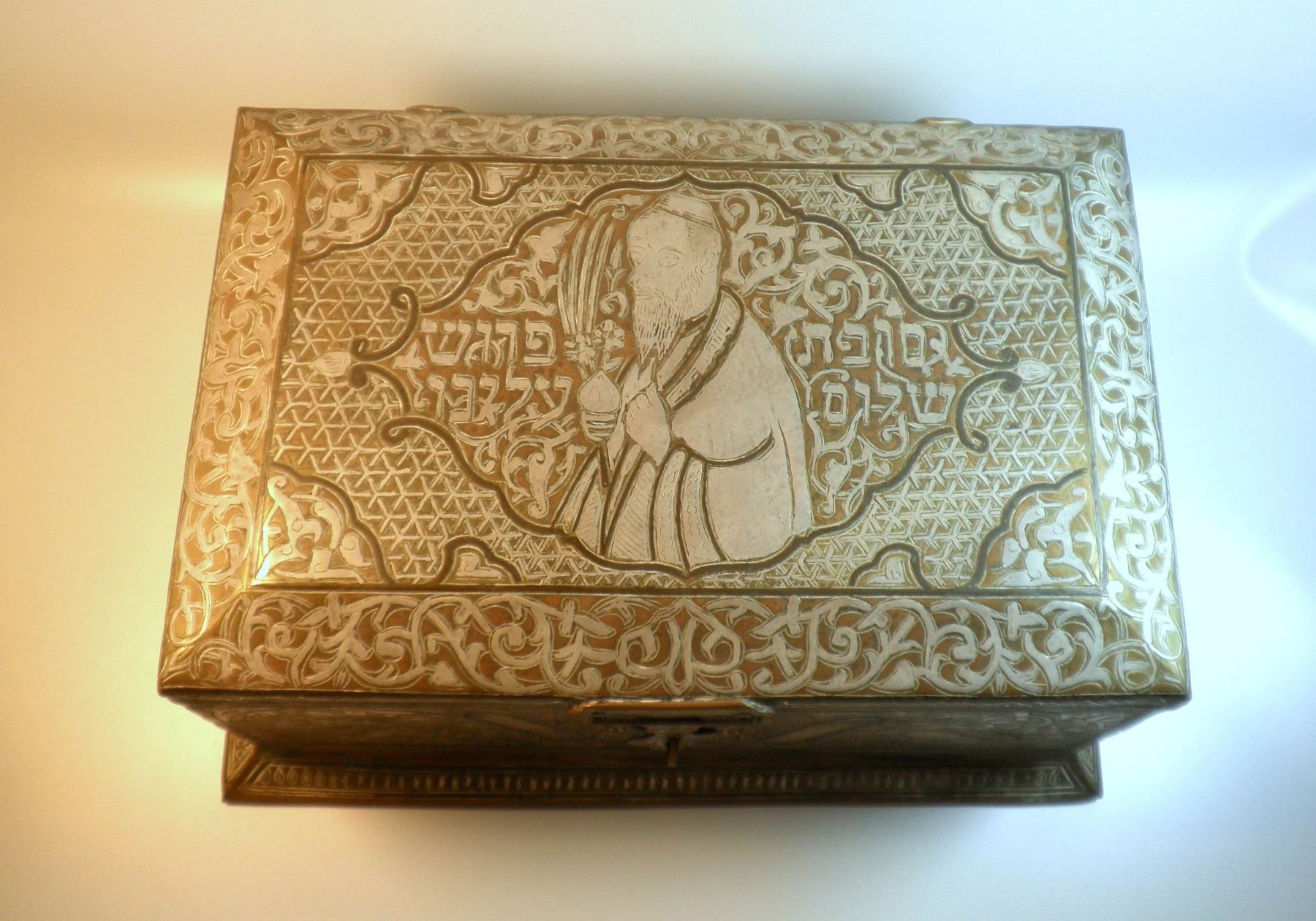 Special! A large Jewish box for sukkot that was intended for use on the second holiday evening in the synagogue, estimate that it is from th first half of the 20th century (possibly even before). The assumption was that it was used to distribute sweets for children in the second holiday evening of Simchat Torah. Made of brass and decorated with quality handcrafted in the style of Damascus and Bezalel works in rich silver inscriptions inalid, on the lid a decoration of a Jew holding the four species and a partial quote of the verse "Succot of peace spreads over us." Interior covered with red velvet. Locking mechanism and high-quality back connections. Dimensions: 32X22X15.5X cm.