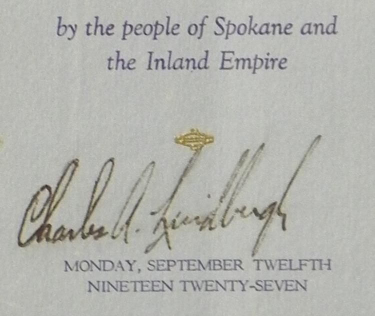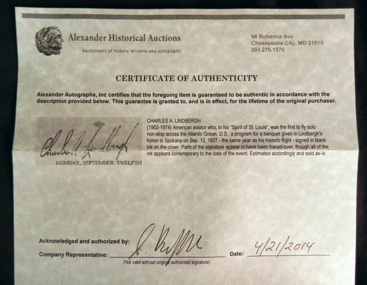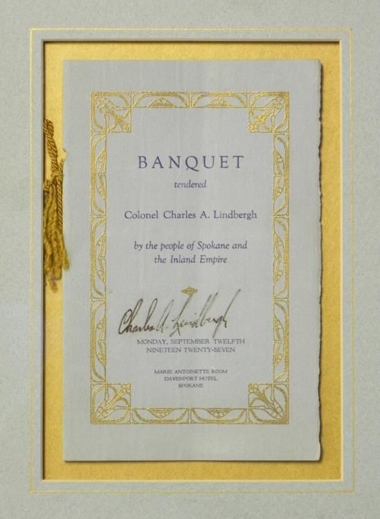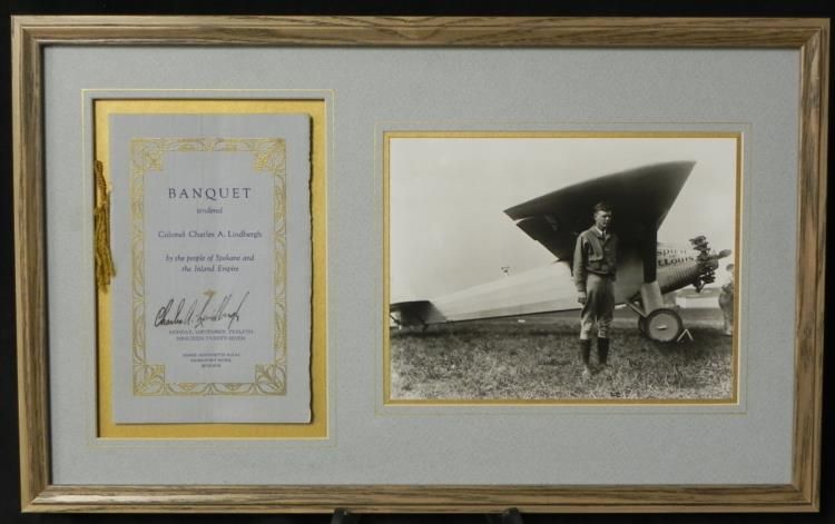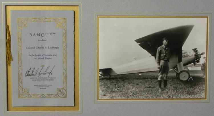 This very special item, which contains Charles A. Lindbergh's signature and a photo of Lindbergh and his plane, is very rare. The Certificate of Authenticity reads "Charles A. Lindbergh -- (1902-1974) American aviator who, in his 'Spirit of St. Louis', was the first to fly solo non-stop across the Atlantic Ocean. D.S., a program for a banquet given in Lindbergh's honor in Spokane on Sep. 12, 1927 - the same year as his historic flight - signed in black ink on the cover. Parts of the signature appear to have been traced-over, though all of the ink appears contemporary to the date of the event."---Charles Augustus Lindbergh, was an American aviator, author, inventor, explorer, and social activist. As a 25-year-old U.S. Air Mail pilot, Lindbergh emerged suddenly from virtual obscurity to instantaneous world fame as the result of his Orteig Prize-winning solo non-stop flight on May 20 21, 1927, made from Roosevelt Field in Garden City on New York's Long Island to Le Bourget Field in Paris, France, a distance of nearly 3,600 statute miles (5,800 km), in a single-engine monoplane "Spirit of St. Louis". As a result of this flight, Lindbergh was the first person in history to be in New York one day and (33 hours later) Paris the next. Lindbergh, a U.S. Army Air Corps Reserve officer, was also awarded the nation's highest military decoration, the Medal of Honor, for his historic exploit.