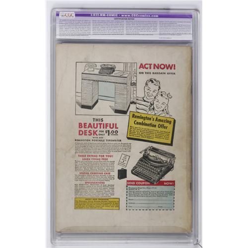 Retells the death of the Comet and the origin of the Hangman. Series became<B> Hangman </B></I>starting with #2. Origin of the Boy Buddies team (Dusty and Roy the Super-Boy). Harry Lucey cover. CGC notes, "Restoration includes: color touch, pieces added, tear seals, spine splits sealed, reinforced. (All 3 edges trimmed)." Overstreet 2006 GD 2.0 value = $296; VG 4.0 value = $592; FN 6.0 value = $888.<BR><BR><b>Shipping:</b> Slabbed Comic (<a target="_blank" href="http://www.heritageauctions.com/common/shipping.php">view shipping information</a>)