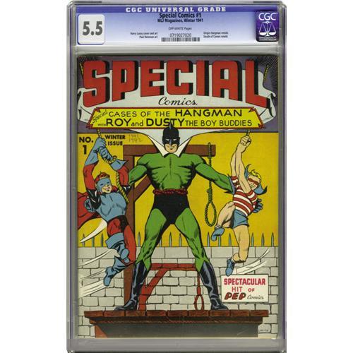 <B>Special Comics #1 (MLJ, 1941) CGC FN- 5.5 Off-white pages.</B></I> This is the de facto <B>Hangman</B></I> #1, as that series began with issue #2 after this successful tryout proved the character would sell well in his own book. The issue starts off with the Hangman retelling his origin and the death of his brother the Comet, both from <B>Pep Comics</B></I> #17. Also in this issue is the origin of the Boy Buddies team (Dusty and Roy the Super-Boy), which involves a brief appearance by the two sidekicks' adult pals the Wizard and the Shield. Harry Lucey drew the cover and the Hangman feature, with arms stretching across panel borders and other Simon and Kirby-like flourishes. Paul Reinman drew the Boy Buddies feature. Overstreet 2006 FN 6.0 value = $888. CGC census 5/06: 1 in 5.5, 2 higher. <BR><BR><B>Important notice:</B> Heritage usually auctions material at the rate of 200-250 lots per hour. On some occasions eBay Live bid software or the Internet may not be able to keep up with the pace of the auction. We recommend placing a realistic absentee bid now as insurance to avoid disappointment. Occasionally the auctioneer may eliminate or reject an eBay Live bid, and the auctioneer may also reopen a lot after the close of the eBay live bidding (usually because we missed an audience bid), and may reject your bid even if it shows you as the winning bidder. By bidding via eBay Live, you agree that Heritage may award the lot to another bidder at its sole discretion under the circumstances described above or any other reasonable circumstances. Since eBay bids are not shown to us until we open the lot on the floor, we treat those bids just like floor bids. In most cases the floor responds before the eBay bid is presented to us, due to Internet lag time, so for consistency we have made it a policy that floor bids are always considered first over tie eBay live bids. Also please note that all Heritage lots purchased through eBay Live carry a 22.5% Buyer's Premium. Please make sure you read the Terms and Conditions before you bid. This lot is being auctioned in conjunction with a live floor auction by Heritage Auction Galleries. All final auction and invoice information will be supplied by Heritage Auction Galleries, and all other information should be considered preliminary. Lot:41001 <BR><BR><B>Winning Notification and Billing:</B> After the FINAL session in this auction is complete, Heritage will send e-mail and snail mail invoices. This process normally takes several days. All final auction and invoice information will be supplied by Heritage Auction Galleries, and all other information should be considered preliminary. <BR><BR>This auction will be conducted on a live auction floor and over the Internet through eBay Live. If you choose to place an absentee bid, please take a moment to <font color='#0000ff'><u><a href='http://pages.ebay.com/liveauctions/help/before/laabsentee.html'>learn how eBay Live absentee bidding works</a></u></font><font color='#000000'>
