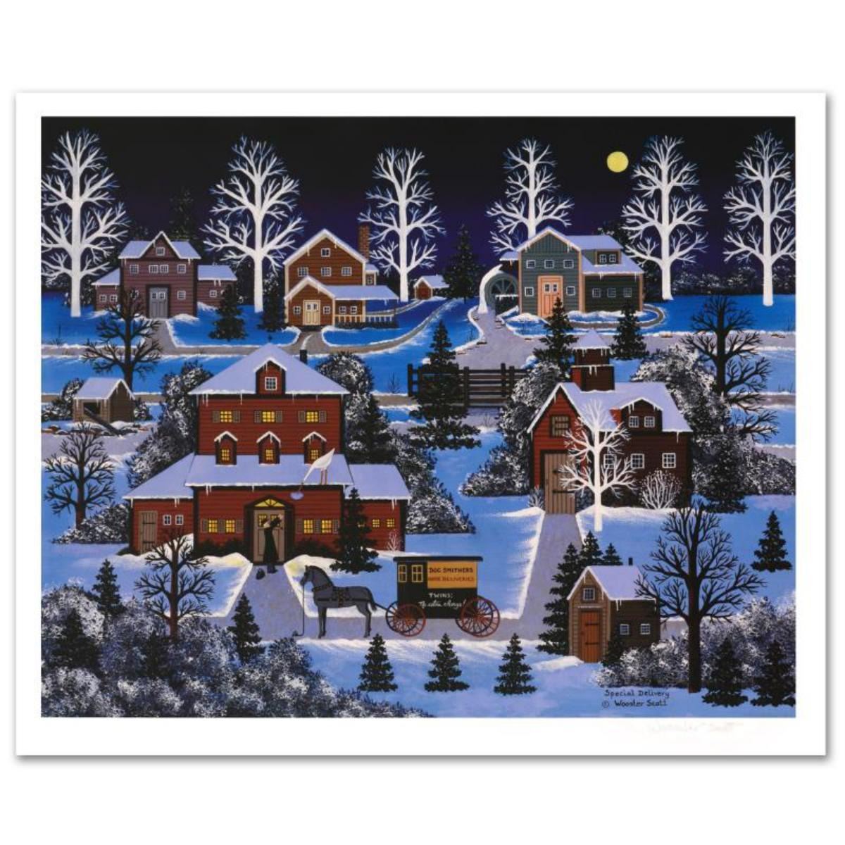 Cozy, down-home images of a bygone era when life was simpler - this is the feeling captured in the creations of one of the world's most recognized artists. "Special Delivery" is a limited edition lithograph on paper, numbered and hand signed by Wooster Scott! Includes Certificate of Authenticity! Measures approx. 25" x 20" (with border), 27" x 23" (image). Reference #: 187082.