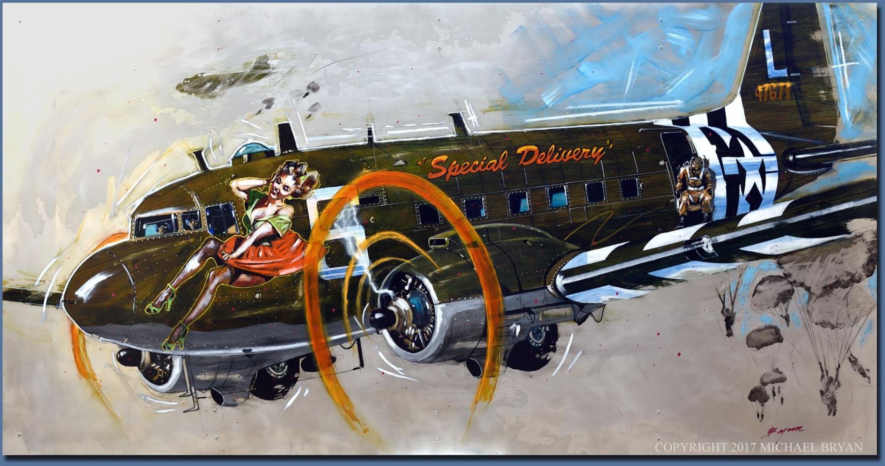 Michael Bryan's "Special Delivery" is a pin-up girl adorned Paratrooper transport from WWII, produced as a 20x40" hand-worked Uniique giclee on canvas , numbered 1/1.
