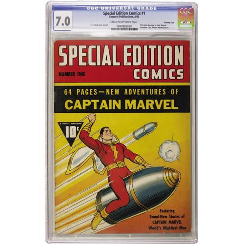 <B>Special Edition Comics #1 Crowley Copy pedigree (Fawcett, 1940) CGC FN/VF 7.0 Cream to off-white pages.</B></I> This one-shot is the first comic book entirely devoted to Captain Marvel; yes, the hero was already the star of <B>Whiz Comics</B></I>, but he shared that title with a bunch of other characters. This comic was reportedly a try-out to test whether kids would buy a comic that was all about Captain Marvel; we don't need to tell you that it succeeded, as <B>Captain Marvel Adventures</B></I> appeared soon thereafter and became the bestselling comic on the stands. Captain Marvel's #1 artist, C. C. Beck, drew the issue's now-famous cover. Only a little damage to the corners keeps this one from grading higher. Overstreet 2006 FN 6.0 value = $2,517; VF 8.0 value = $5,873. CGC census 10/06: 4 in 7.0, 9 higher.<BR><BR><b>Shipping:</b> Slabbed Comic (<a target="_blank" href="http://www.heritageauctions.com/common/shipping.php">view shipping information</a>)