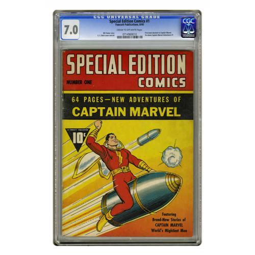 <B>Special Edition Comics #1 (Fawcett, 1940) CGC FN/VF 7.0 Cream to off-white pages.</B></I> This wasn't just the first comic book devoted entirely to Captain Marvel, it was the first Fawcett comic devoted entirely to <I>anyone</B></I> -- up until this time, all Fawcett books had been anthologies like <B>Whiz Comics</B></I>, <B>Master Comics</B></I>, etc. The wildly popular series <B>Captain Marvel Adventures</B></I> would soon follow. The famous cover is by C. C. Beck. Overstreet 2005 FN 6.0 value = $2,517; VF 8.0 value = $5,873. CGC census 12/05: 4 in 7.0, 9 higher.