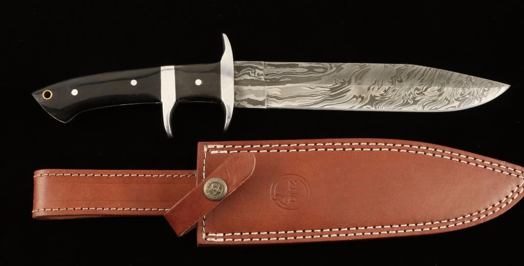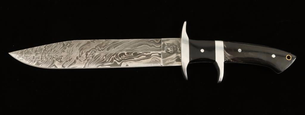 Philippine Black Bull Horn Handle. The blade is approx. 8 1/4" and the handle is approx. 5.5" with a silver/aluminum double guard. The blade is custom forged, hand pounded/folded steel with 250 layers of 1095 and 15N20 steel. A high quality leather sheath is provided. Everything is USA handmade within the family. Approx. 10 hours of work went into this knife and sheath. Kevin Johnson, DNZ Trading Company Mint.