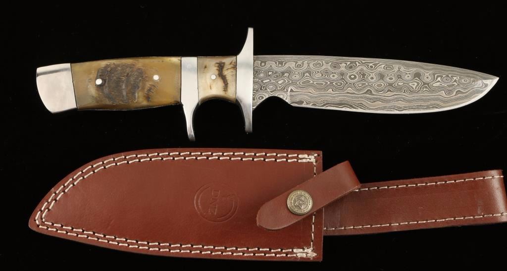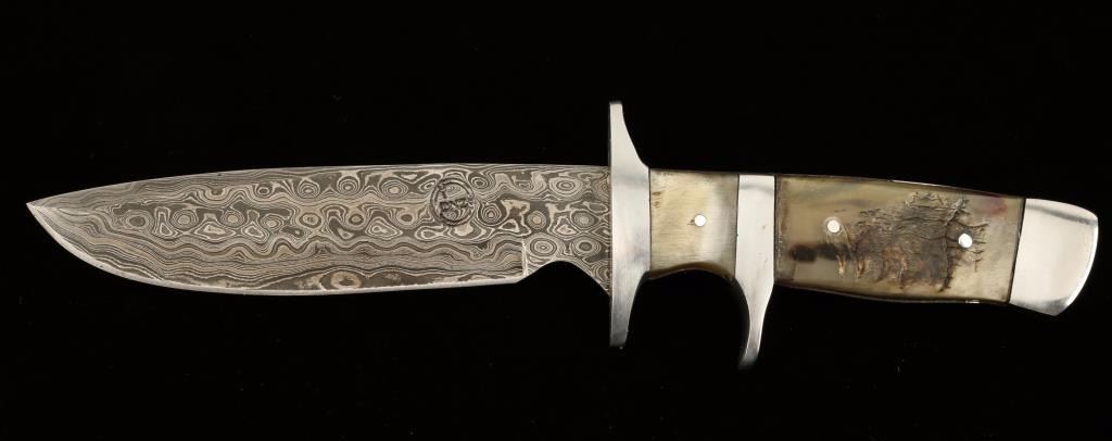 Damascus Steel with a Ram Horn Handle. The blade is approx 6" and the handle is approx. 5" with a silver/aluminum double guard. The blade is custom forged, hand pounded/folded steel with 250 layers of 1095 and 15N20 steel. A high quality leather sheath is provided. Everything is USA handmade within the family. Approx. 10 hours of work went into this knife and sheath. Kevin Johnson, DNZ Trading Company Mint.