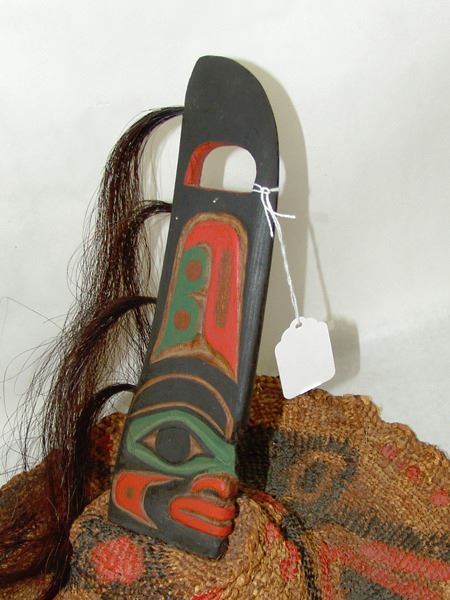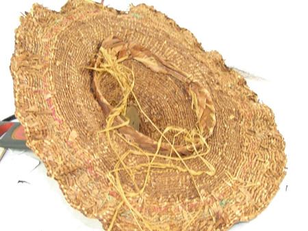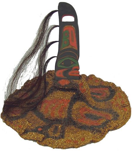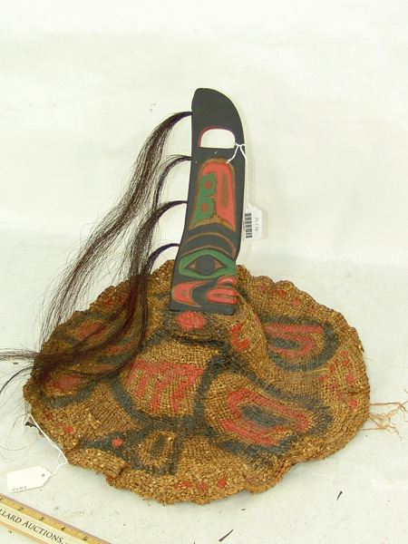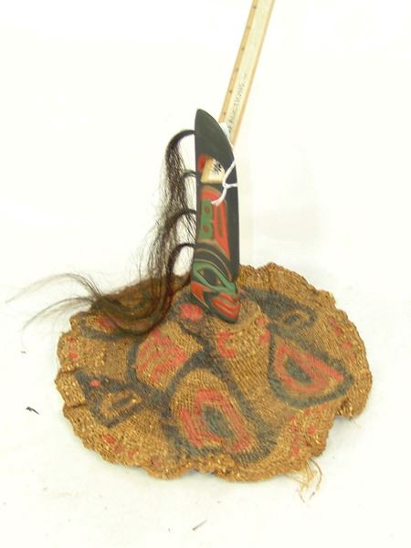 Mid 1900s, Rare hand woven and painted cedar bark basketry hat with woven-in brim and hand carved and painted dorsal fin figure on top made from cedar. Very good condition. 14" x 14"