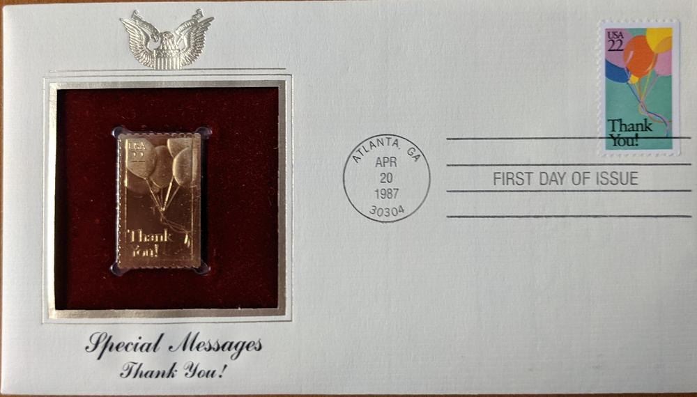 Special Messages Thank You Gold Stamp Replica First Day Cover. Atlanta, GA Apr. 20 1987