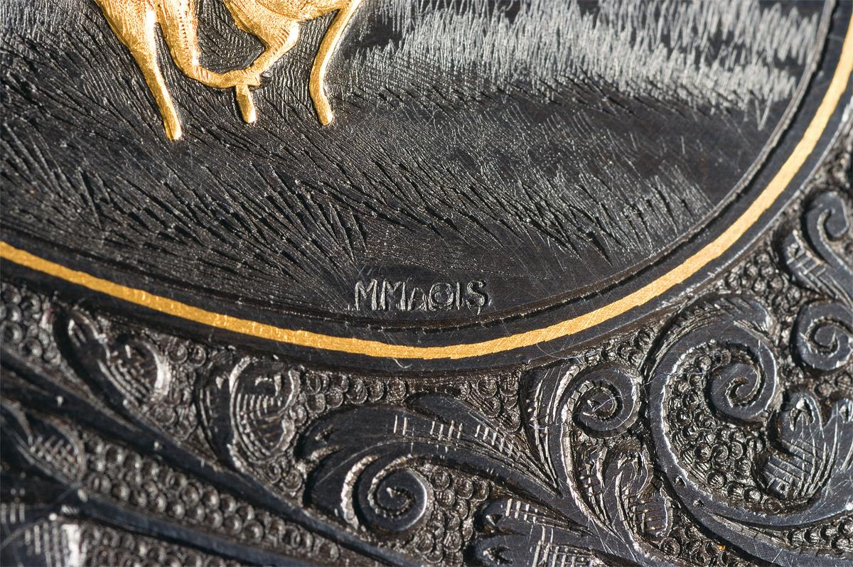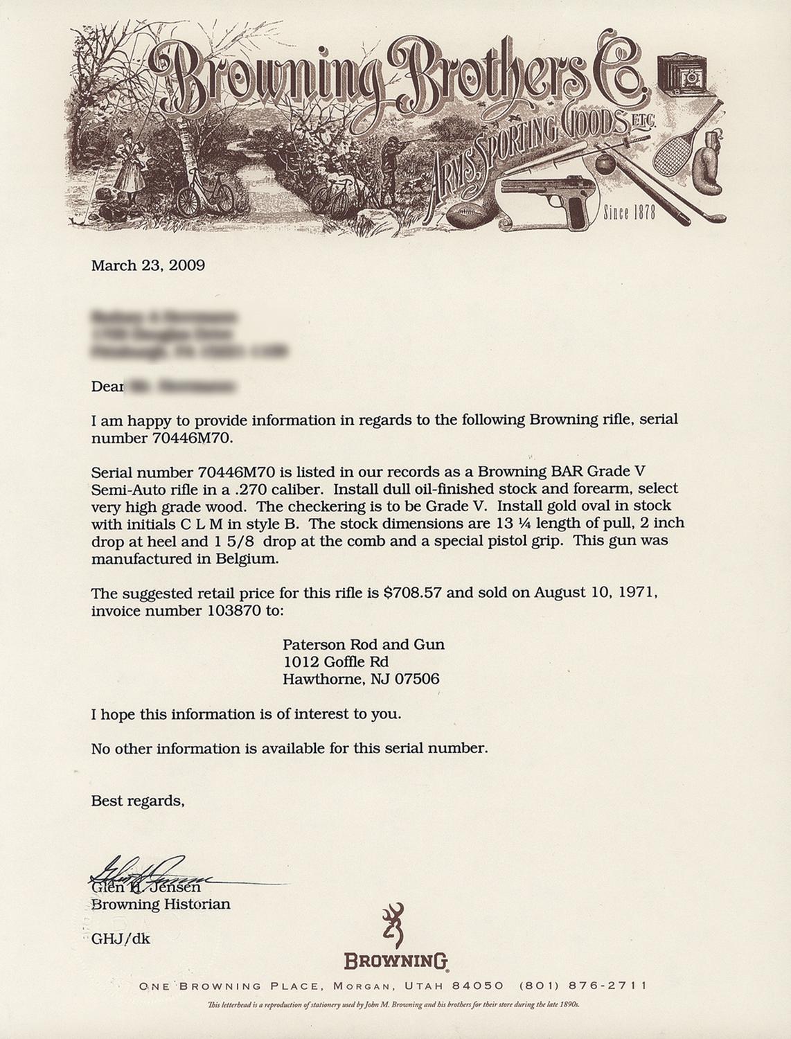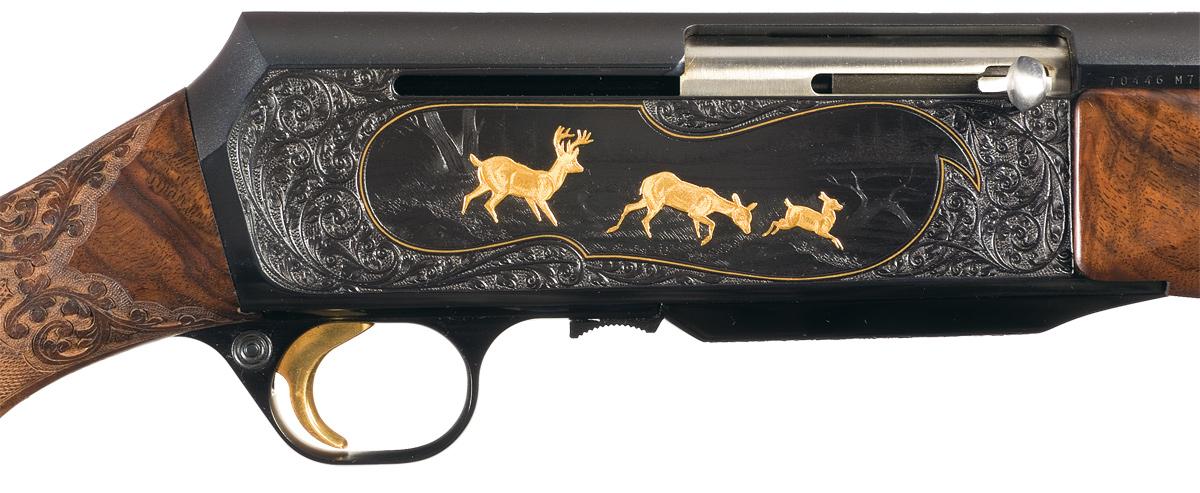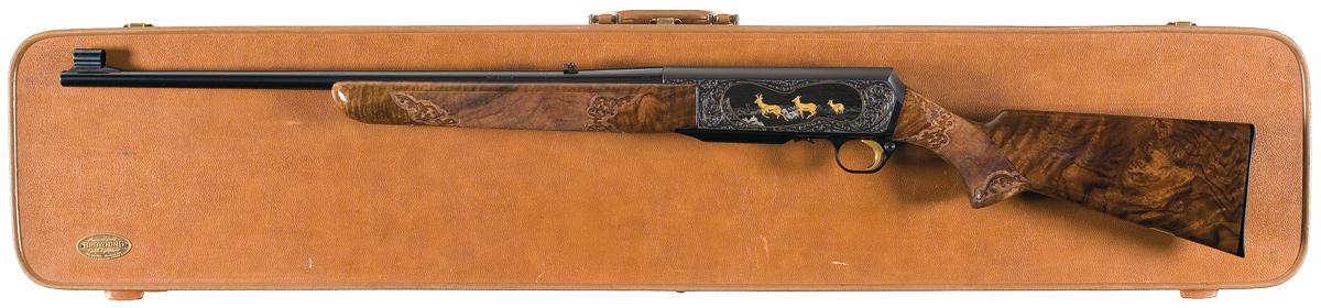 Manufactured in Belgium, this Grade V rifle features an all blue finish with hooded ramp front sight and adjustable folding leaf rear sight. The top of the receiver has a matte finish and is factory drilled and tapped for scope mounting. The sides of the receiver, bottom of the magazine and the trigger guard feature nice floral scroll engraving with a stippled background. The left side of the receiver has three gold inlaid running deer in a plains scene with a gold inlaid line border and the right side has three gold inlaid deer in a field scene with a gold inlaid line border. The bottom rear of the scene on the left side is signed "M MAGIS". The trigger is gold and the rifle is mounted with an extra fancy high grade forearm and stock with a dull oil finish, fine hand checkered with carved floral scroll accents with stippled background, gold initial oval and black plastic Browning buttplate. The accompanying factory letter verifies the serial number, Grade V in 270 caliber, select very high grade dull oil finished wood, Grade V checkering, special pistol grip and gold stock oval to be inscribed "CLM" in style B, (not marked now) gives the stock dimensions and that it was sold on August 10, 1971 to Paterson Rod and Gun, Hawthorne, N.J. Complete with a Browning case.