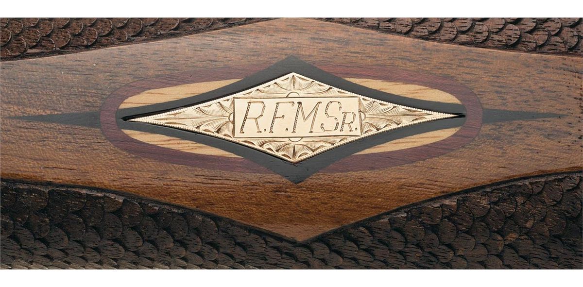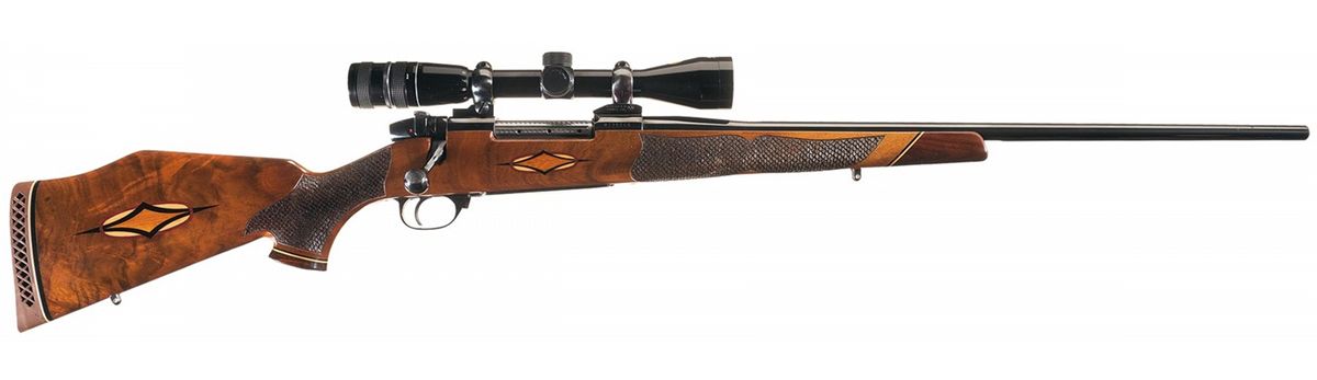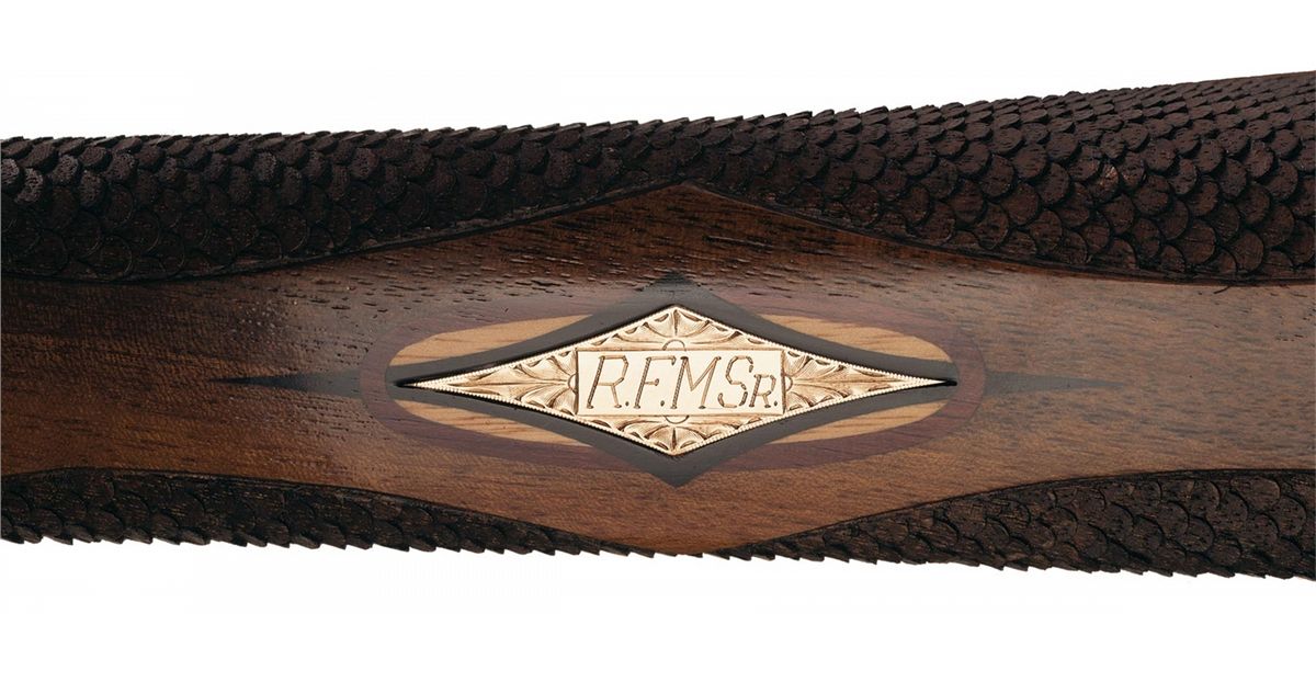 This is an example of a Japanese manufactured special order Mark V Rifle. The barrel is manufactured without sights and the rifle is equipped with a Weatherby Premier 3x-9 scope on Buehler mounts. The hinged floor plate is floor engraved with "WEATHERBY CUSTOM" in a banner. Jeweled fluted bolt and follower. Extra fancy stock with carved fish scale pattern in lieu of checkering on the forearm and pistol grip. Fancy exotic wood diamond inlays are featured on the stock on each side of the action and underside of forearm with a larger inlay on the right side of the buttstock. The diamond inlay on the forearm also has initials in gold inlay: "RFM SR." Contrasting rosewood forend tip and grip cap with the addition of a diamond inlay on the grip cap. Fitted with a vented Weatherby recoil pad and sling swivel studs.