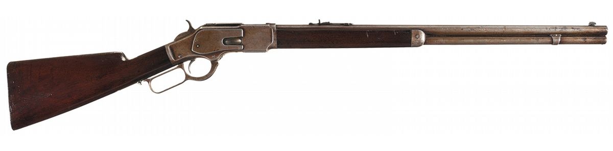 Manufactured in 1882, this Third Model production features the dust cover guide rail integral to the top of the receiver and dust cover has the serrated finger grip on the rear. Blade front and adjustable semi-buckhorn rear sights, the top of the barrel is marked with the two- line address/King's improvement patent dates ahead of the rear sight and "38 -- CAL" at the breech. The upper tang is marked "MODEL. 1873" flanked by the decorative foliate design, the serial number is at the rear of the lower tang and the bottom of the brass cartridge elevator is marked "38 CAL." Full magazine tube and mounted with a smooth walnut forearm and straight grip stock with forend cap and special order iron shotgun buttplate.