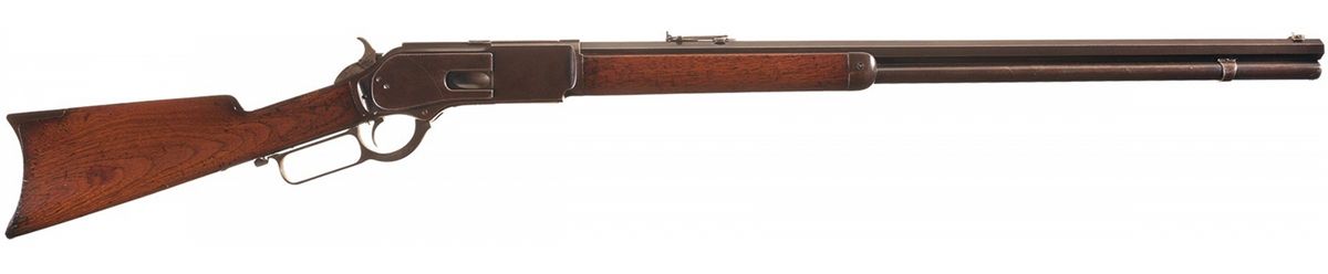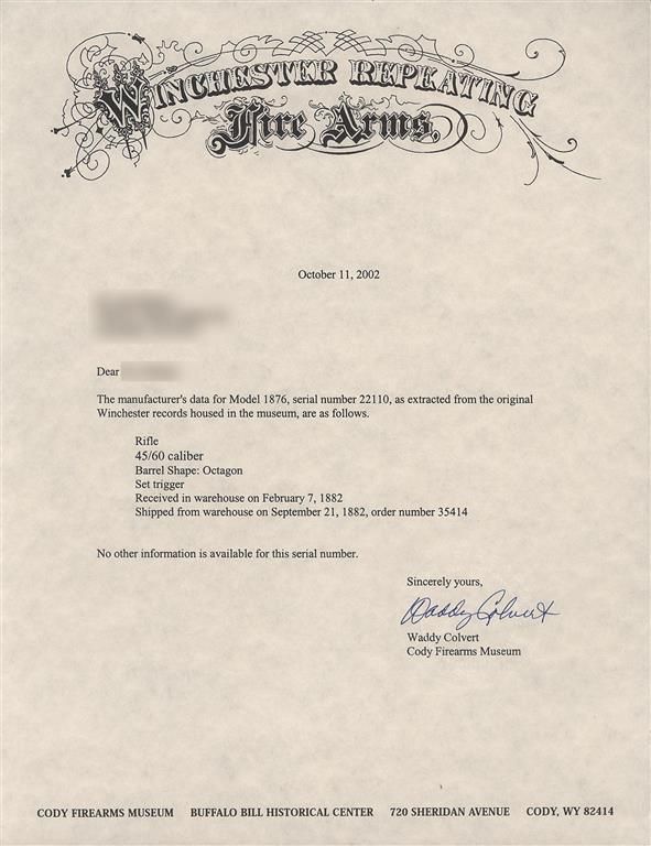 Manufactured in 1882, this is a Second Model 1876 Lever Action rifle with the dust cover guide rail secured to the receiver with two screws. Blade front sight and adjustable sporting leaf rear sight graduated to 1,000 yards and marked "1876" at the top. The top barrel flat is marked "WINCHESTER'S- REPEATING ARMS. NEW HAVEN. CT/KING'S- IMPROVEMENT- PATENTED-MARCH 29. 1866. OCTOBER 16. 1860." ahead of the rear sight and "CAL 45-60" at the breech. The bottom of the brass elevator is marked "45-60". The upper tang is marked "MODEL. 1876." and the serial number is marked on the lower tang. The rifle is equipped with a special order factory single set trigger. Mounted with a smooth walnut forearm and straight grip stock with a steel end cap and steel crescent buttplate with compartment (cleaning rod not included).The accompanying factory letter verifies the rifle configuration, caliber, octagon barrel, set trigger that it was received in the warehouse on February 7, 1882 and shipped to order number 35414 on September 21, 1882.
